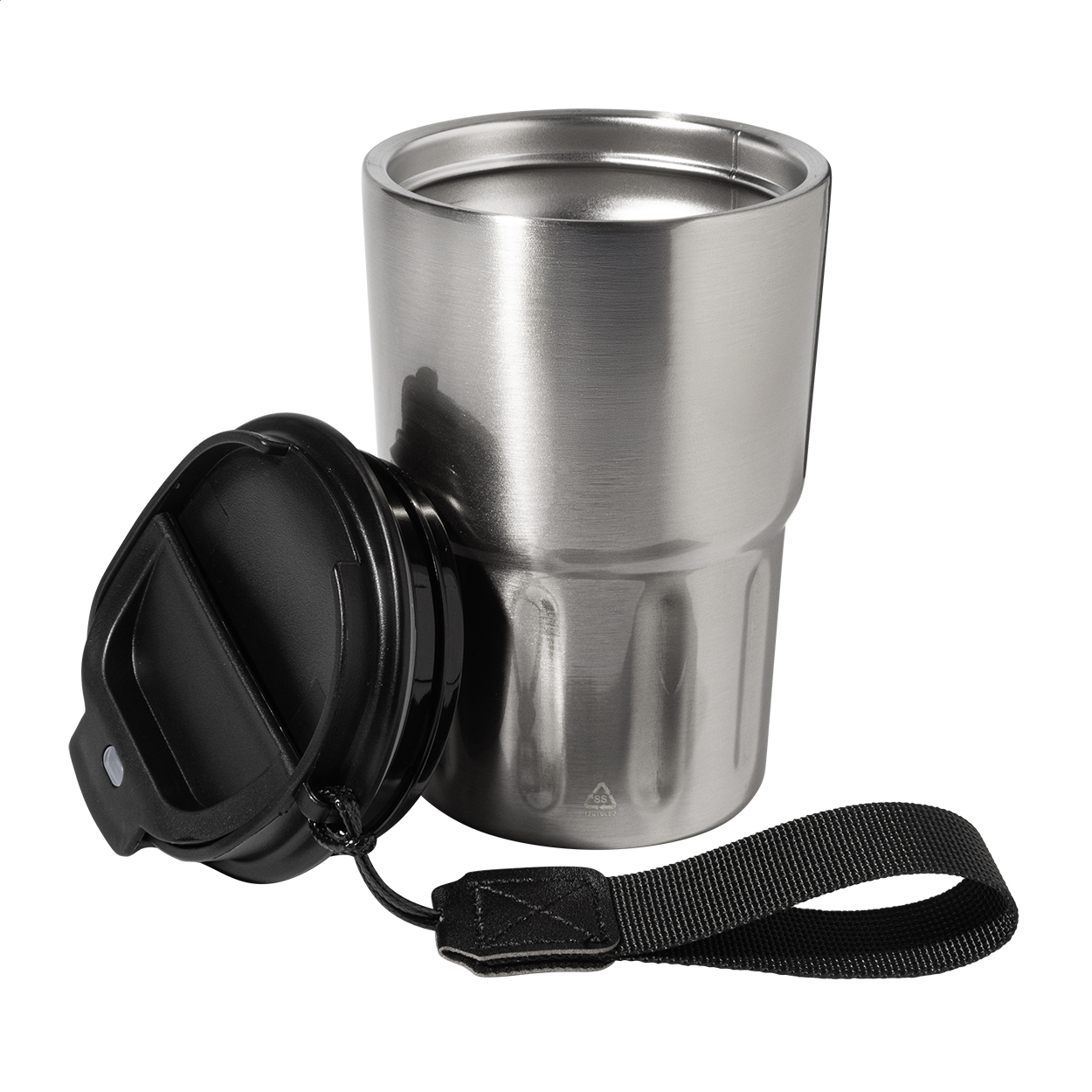 Bicchiere termico da 350ml in acciaio riciclato a doppia parete con coperchio in PP e cinturino in poliestere RPET.
