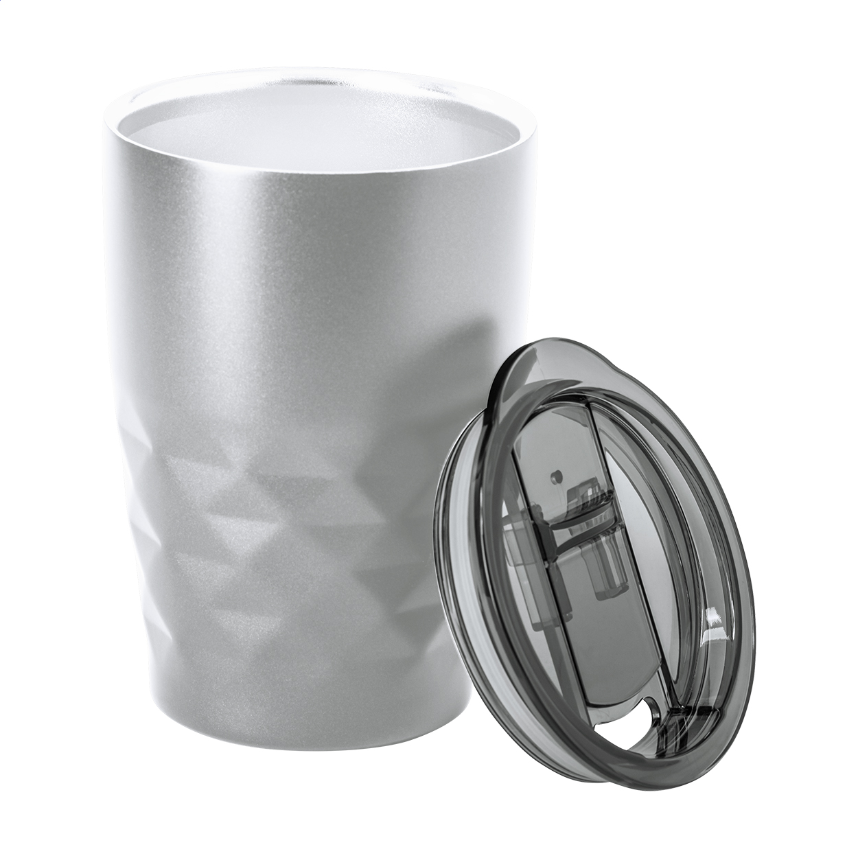 Bicchiere termico da 350ml. in acciaio a doppia parete con tappo erogatore in plastica ed isolamento in rame che permette di mantenere il contenuto caldo per 12 ore e freddo per 24 ore.