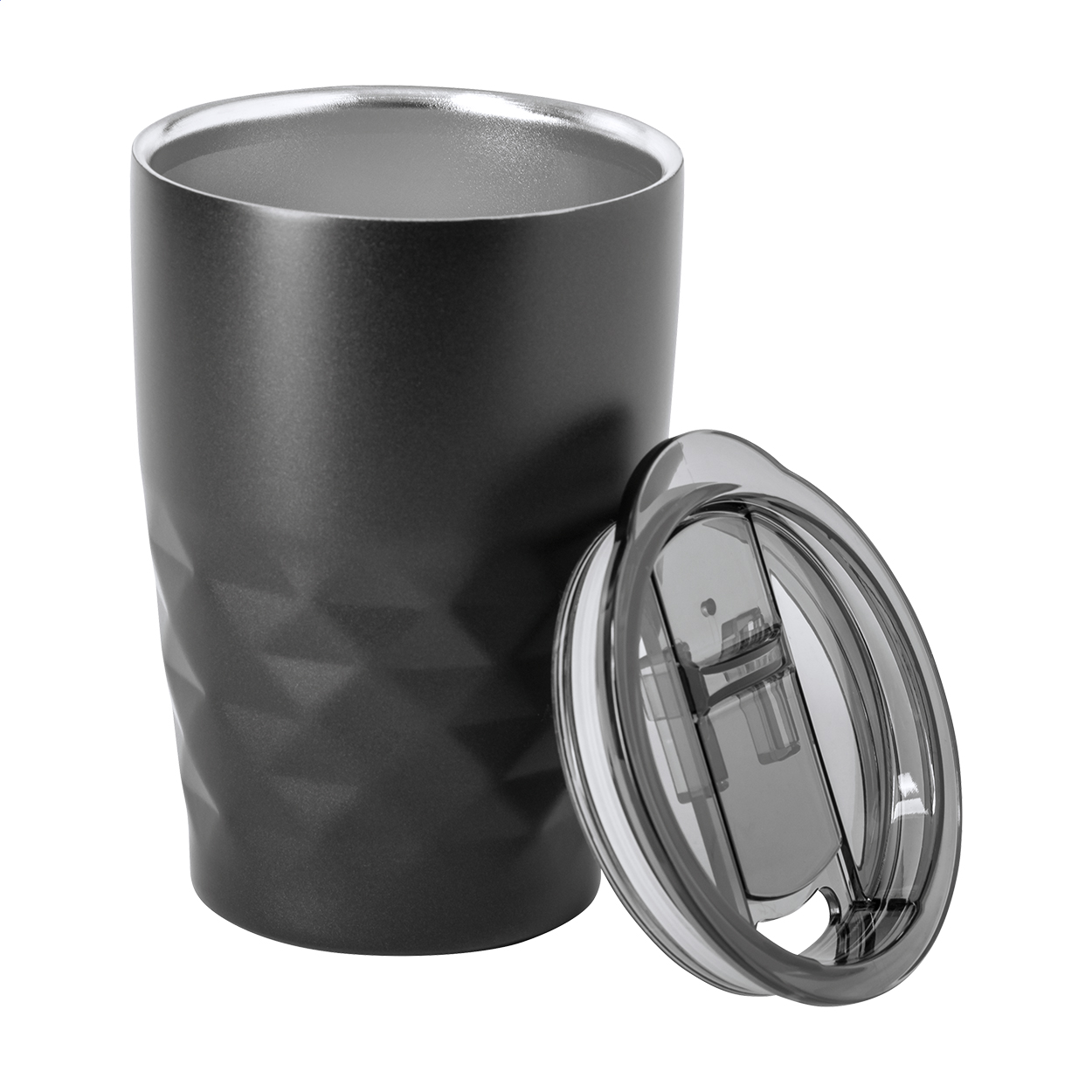 Bicchiere termico da 350ml. in acciaio a doppia parete con tappo erogatore in plastica ed isolamento in rame che permette di mantenere il contenuto caldo per 12 ore e freddo per 24 ore.