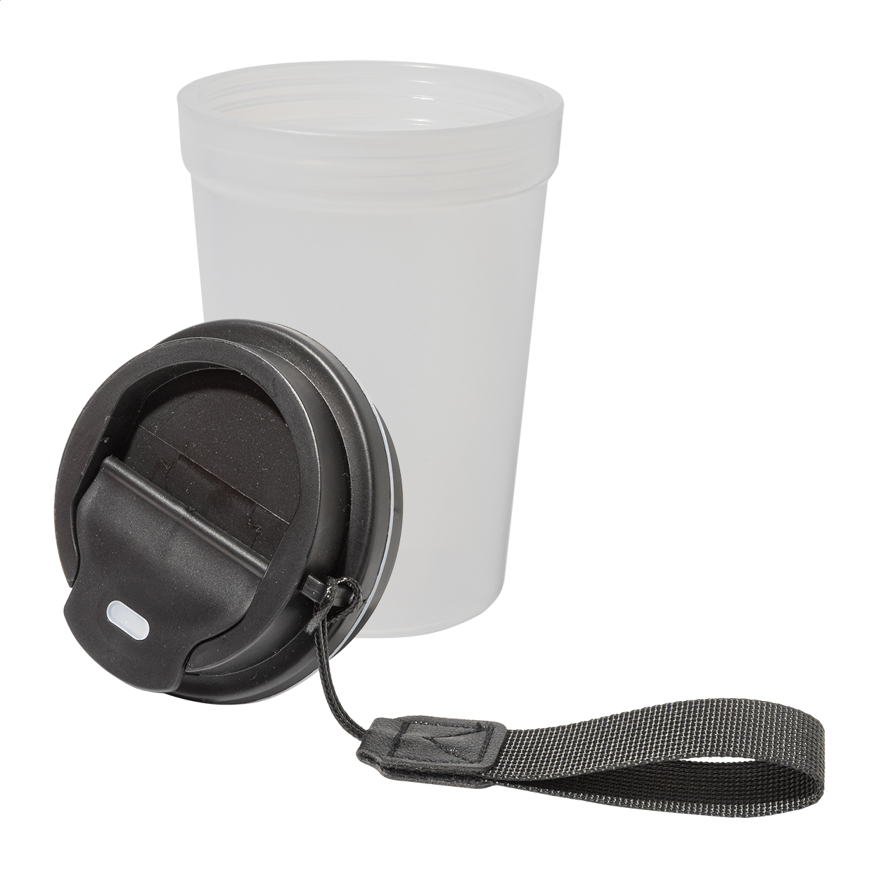 Bicchiere da viaggio da 400ml in plastica PP a parete singola con finitura satinata, coperchio salvagoccia e fascetta in poliestere RPET.