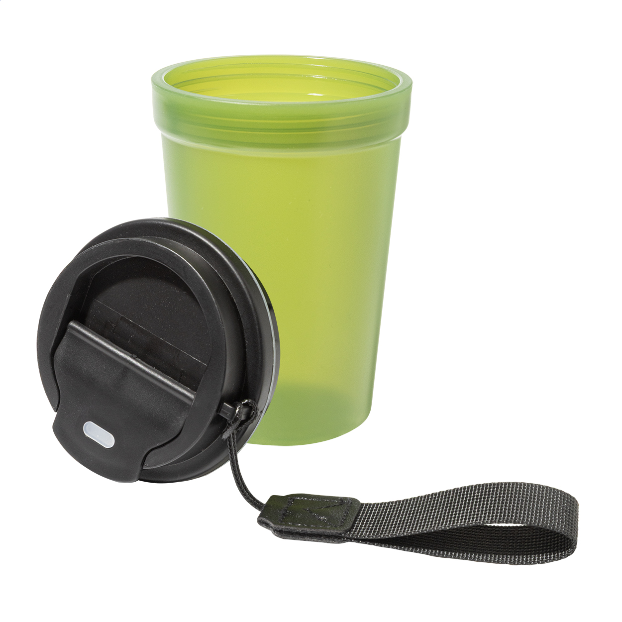 Bicchiere da viaggio da 400ml in plastica PP a parete singola con finitura satinata, coperchio salvagoccia e fascetta in poliestere RPET.