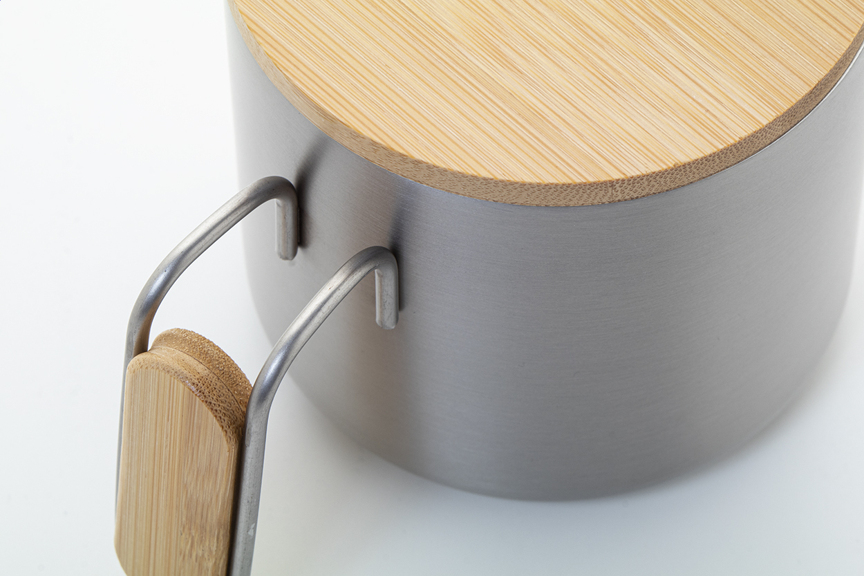 Tazza mug termica da 300 ml. a doppia parete, in acciaio inox riciclato con coperchio e manico in bambù.