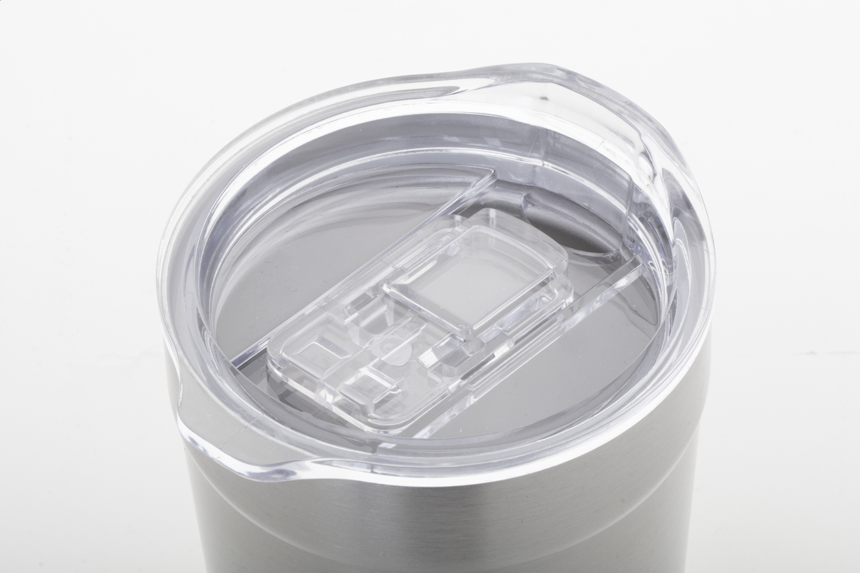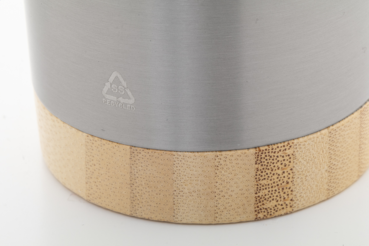 Bicchiere termico da 600ml. a doppia parete, in acciaio inox riciclato con base in bambù e coperchio in plastica AS.