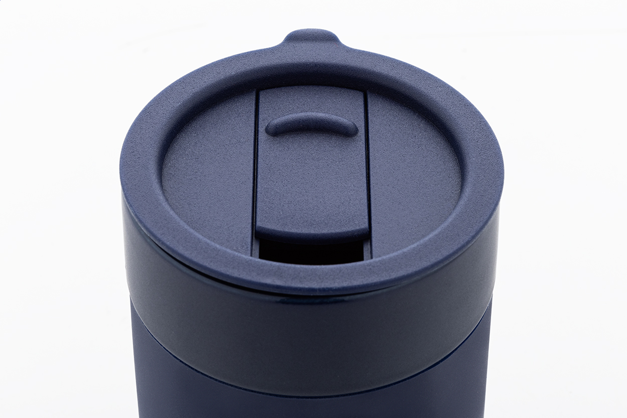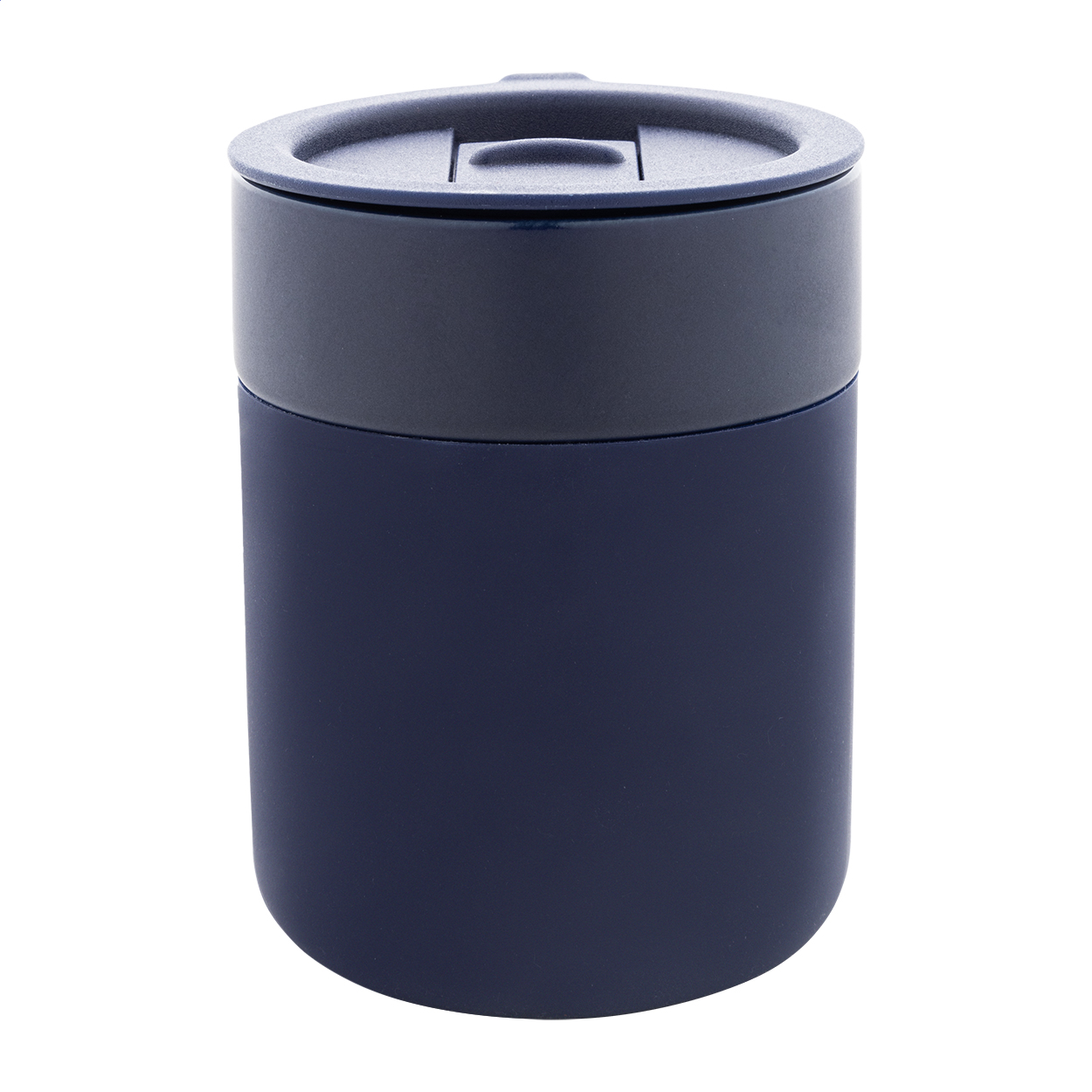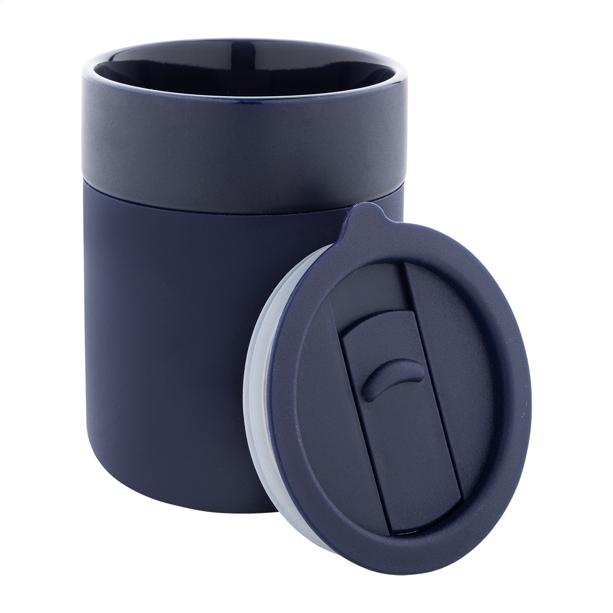 Bicchiere da viaggio da 300ml. in ceramica rivestita con silicone e coperchio in plastica PP.