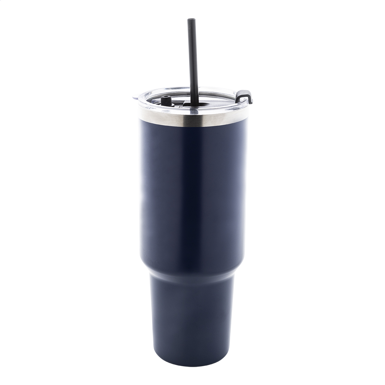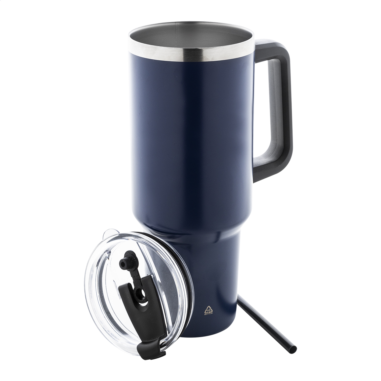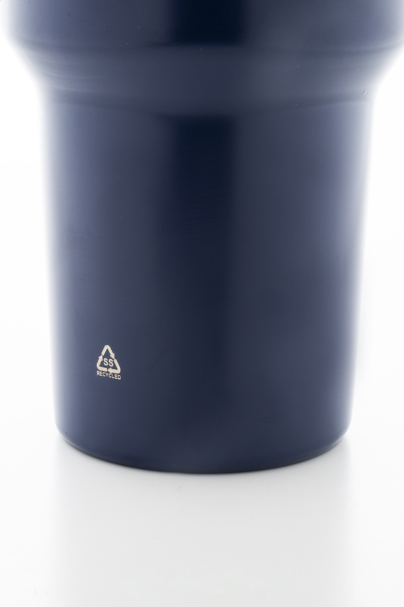 Tazza mug termica da 1200 ml. in acciaio riciclato a doppia parete, con coperchio in PS e cannuccia in PP.