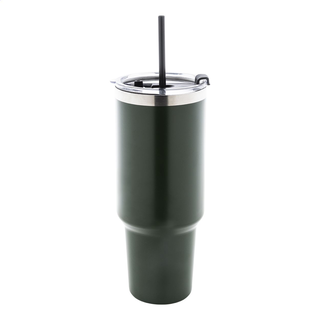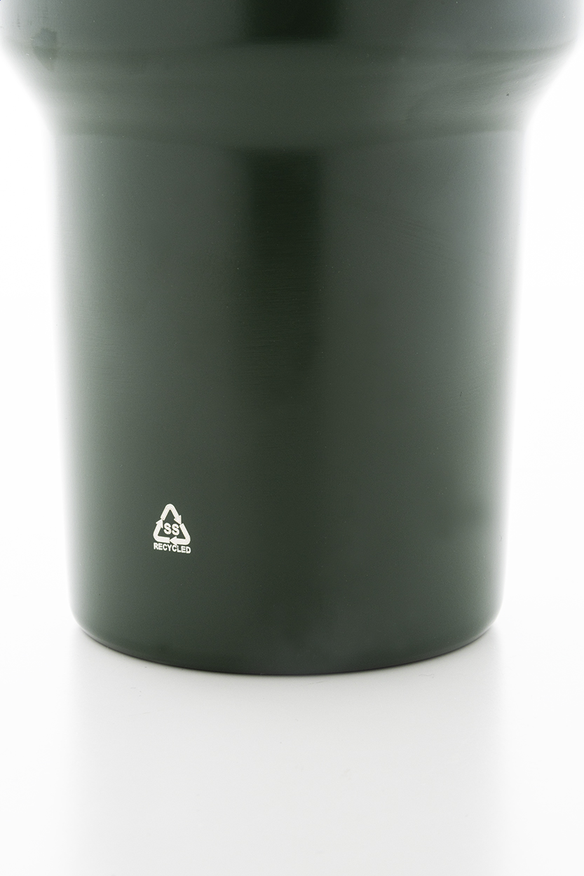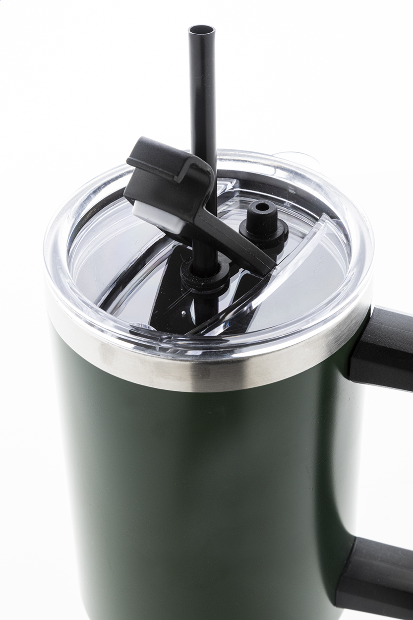 Tazza mug termica da 1200 ml. in acciaio riciclato a doppia parete, con coperchio in PS e cannuccia in PP.