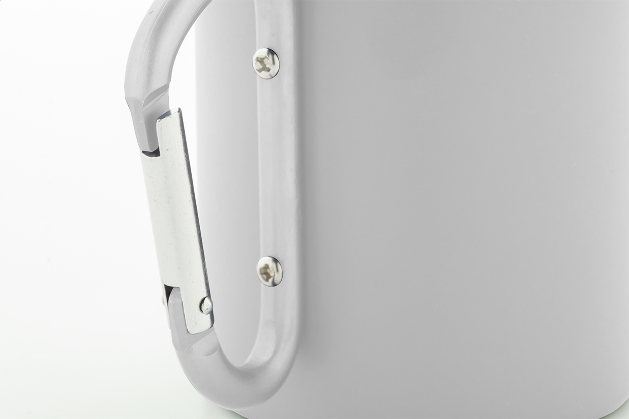 Tazza mug termica da 300ml. in acciaio riciclato a doppia parete, con manico a moschettone in alluminio riciclato di colore coordinato e scatola in cartoncino kraft.