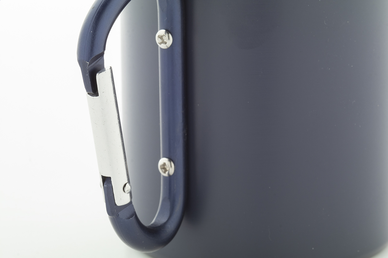 Tazza mug termica da 300ml. in acciaio riciclato a doppia parete, con manico a moschettone in alluminio riciclato di colore coordinato e scatola in cartoncino kraft.