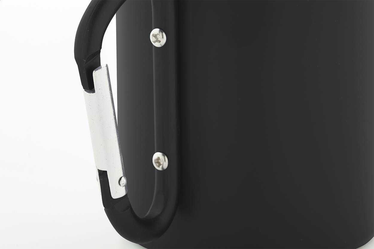 Tazza mug termica da 300ml. in acciaio riciclato a doppia parete, con manico a moschettone in alluminio riciclato di colore coordinato e scatola in cartoncino kraft.