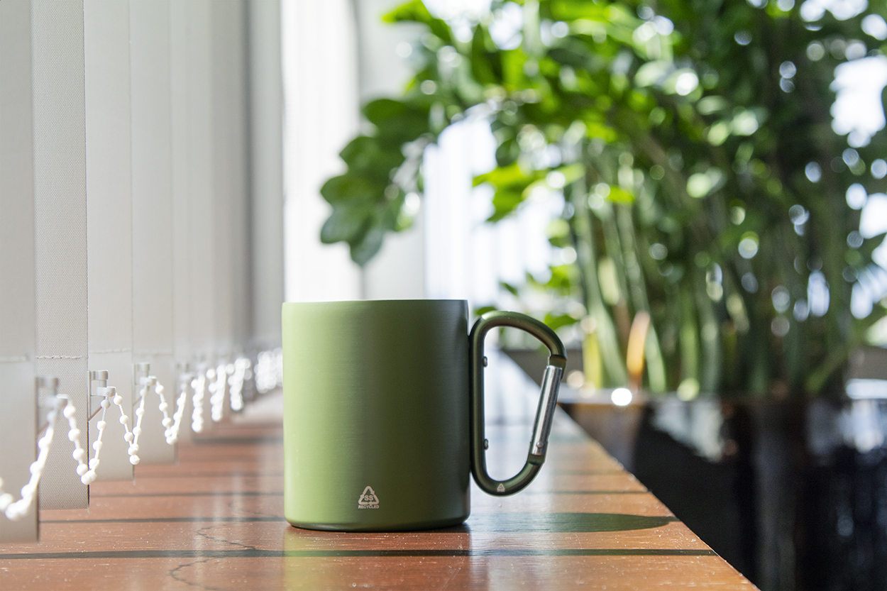 Tazza mug termica da 300ml. in acciaio riciclato a doppia parete, con manico a moschettone in alluminio riciclato di colore coordinato e scatola in cartoncino kraft.