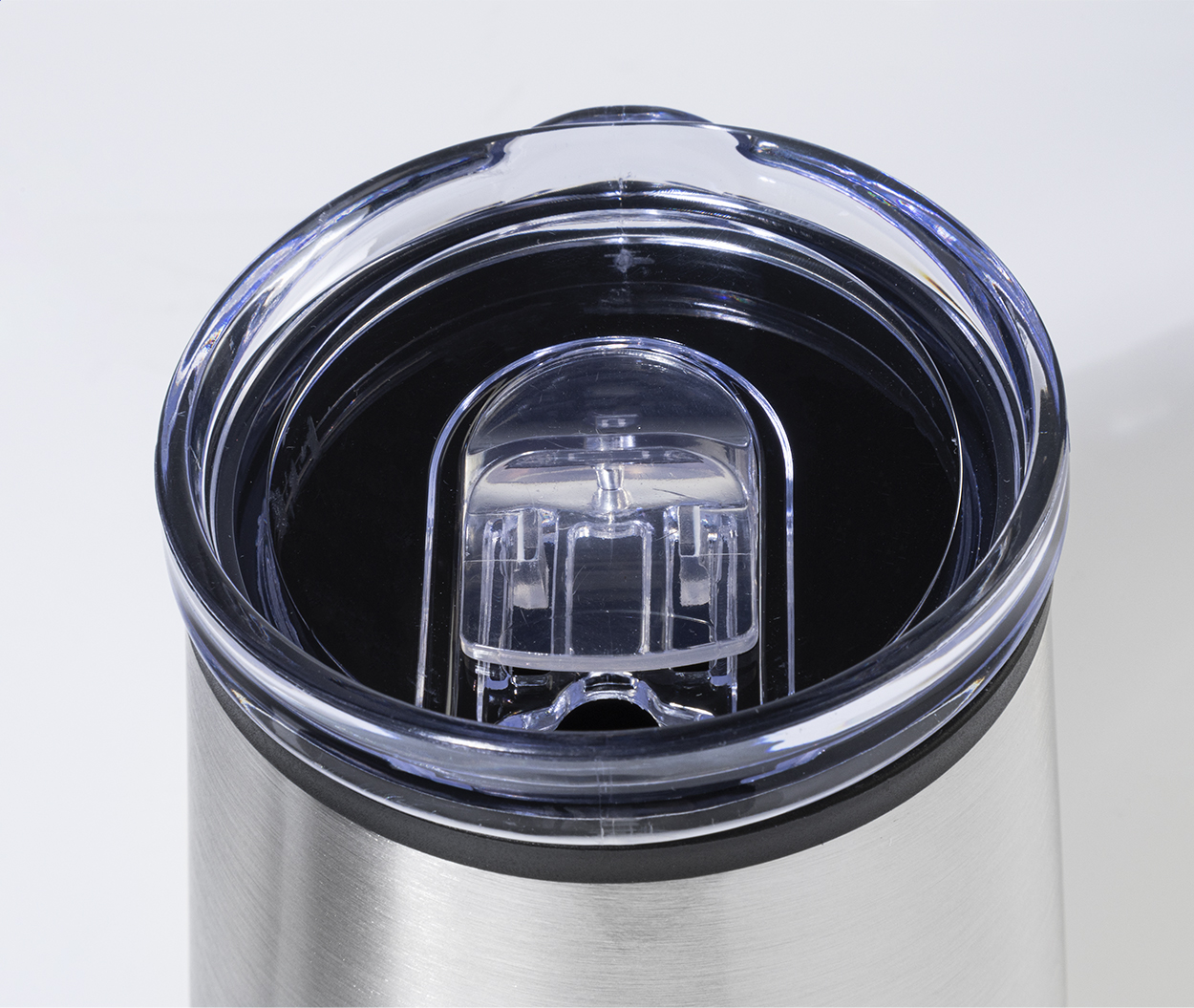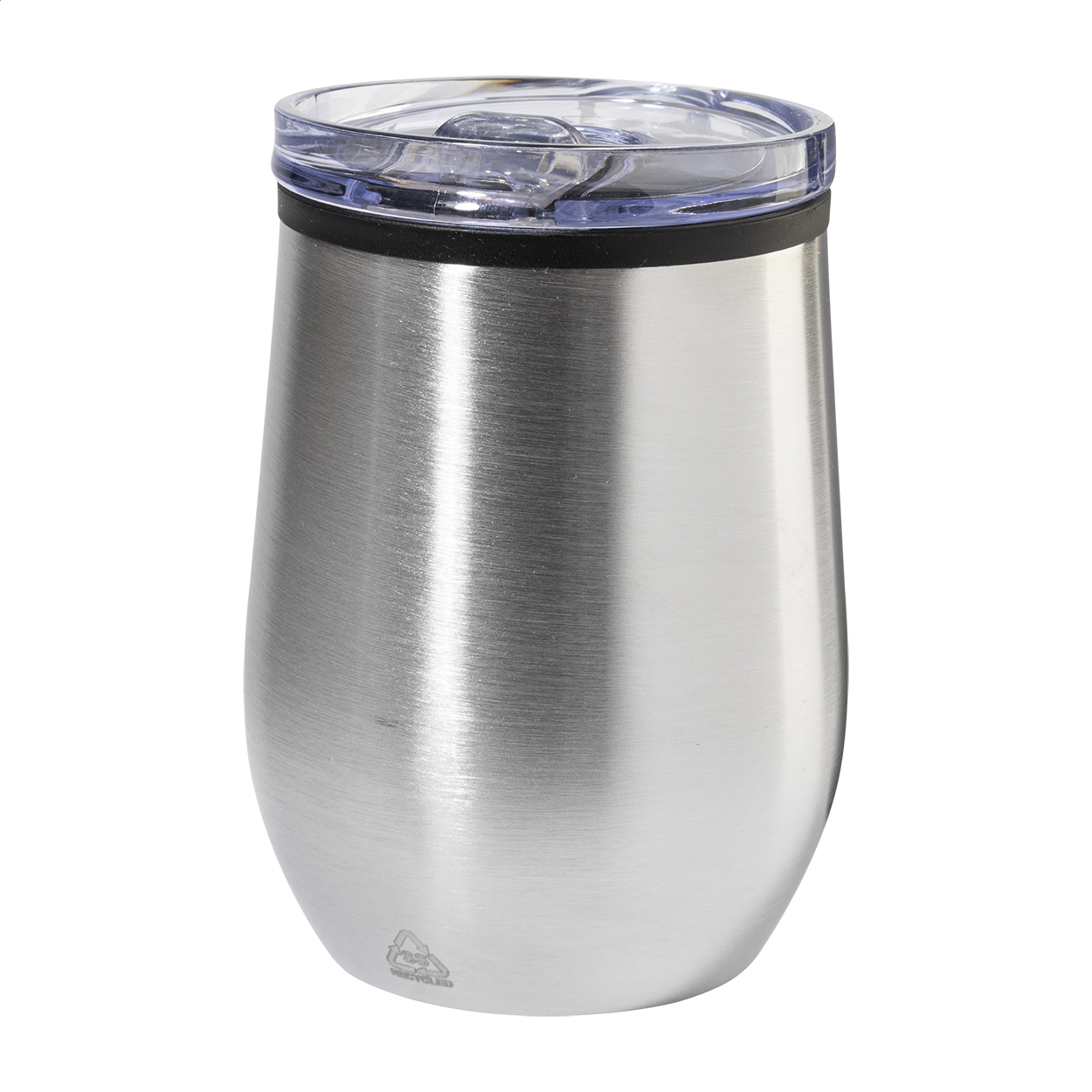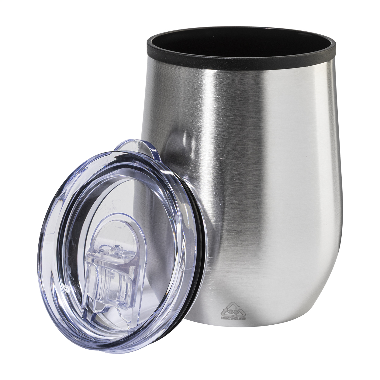 Bicchiere termico in acciaio riciclato a doppia parete da 350ml con interno in PP e coperchio erogatore in PS.