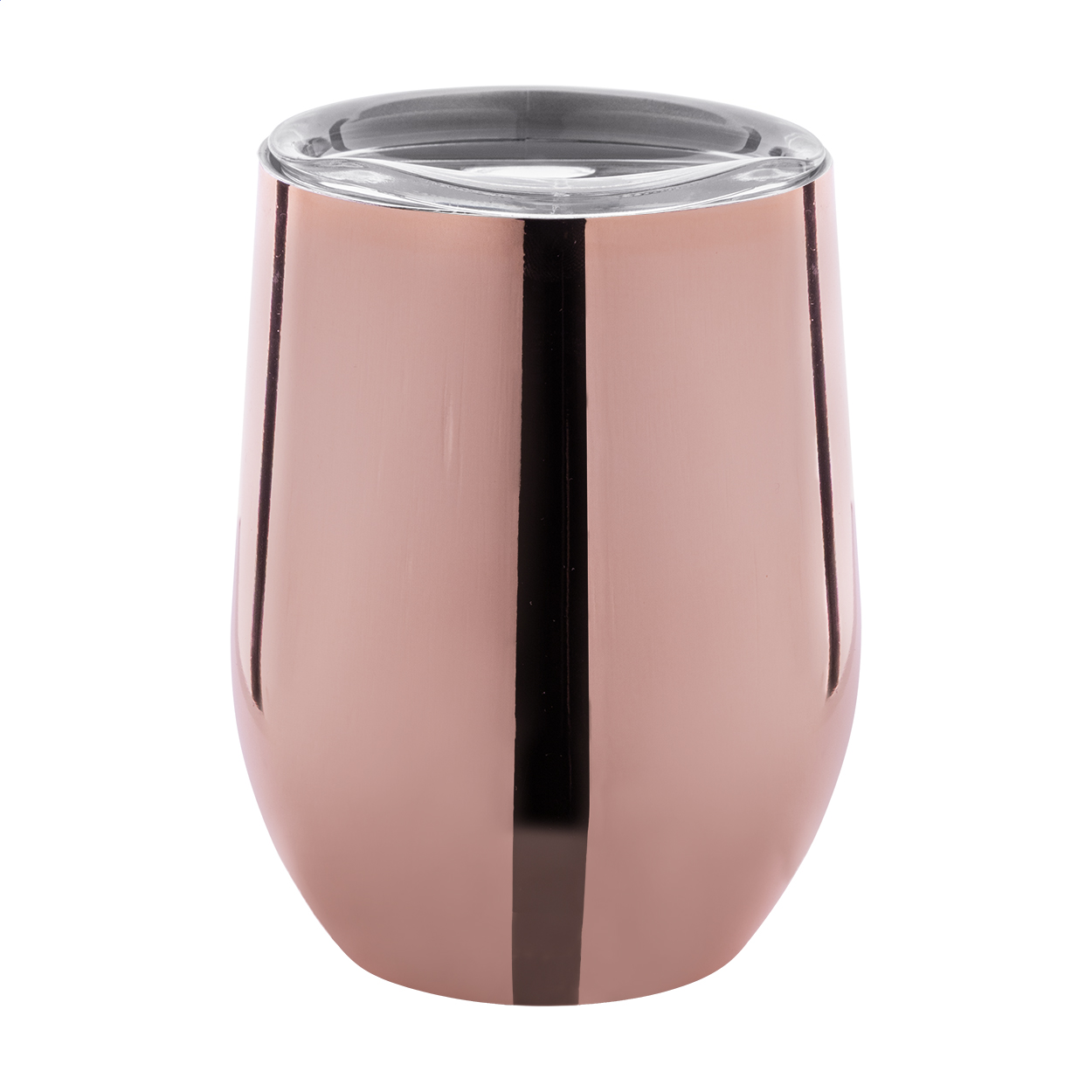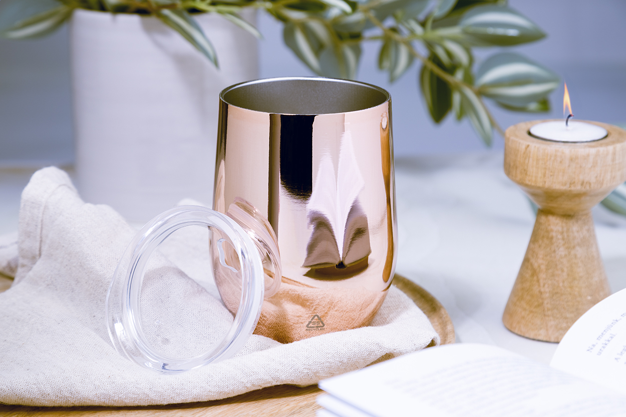 Bicchiere termico a doppia parete da 350 ml. in acciaio riciclato con finitura metallica lucida e coperchio in plastica.