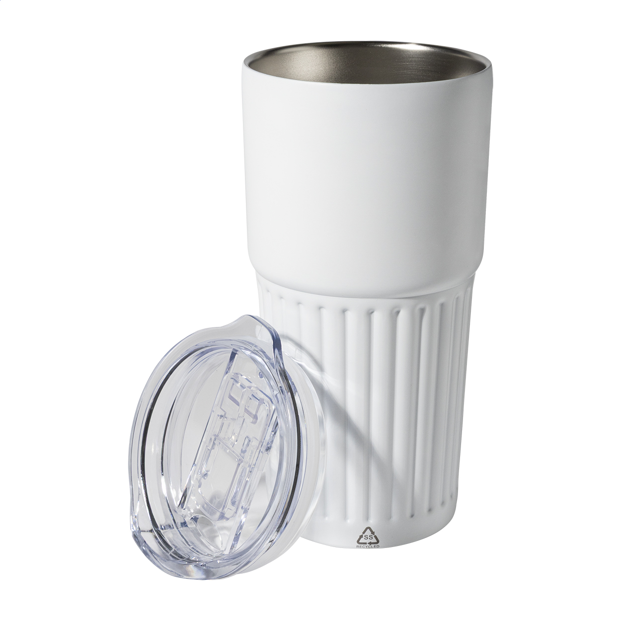 Tazza termica a doppia parete in acciaio inox riciclato da 600 ml. con coperchio in plastica ABS.