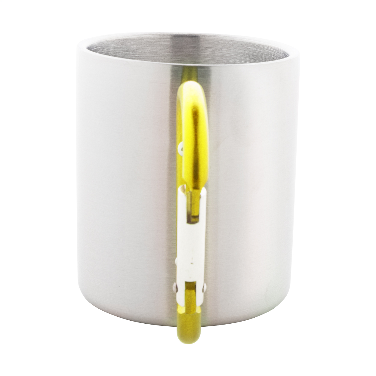 Tazza mug in acciaio da 200ml. con moschettone colorato e confezione in scatola.