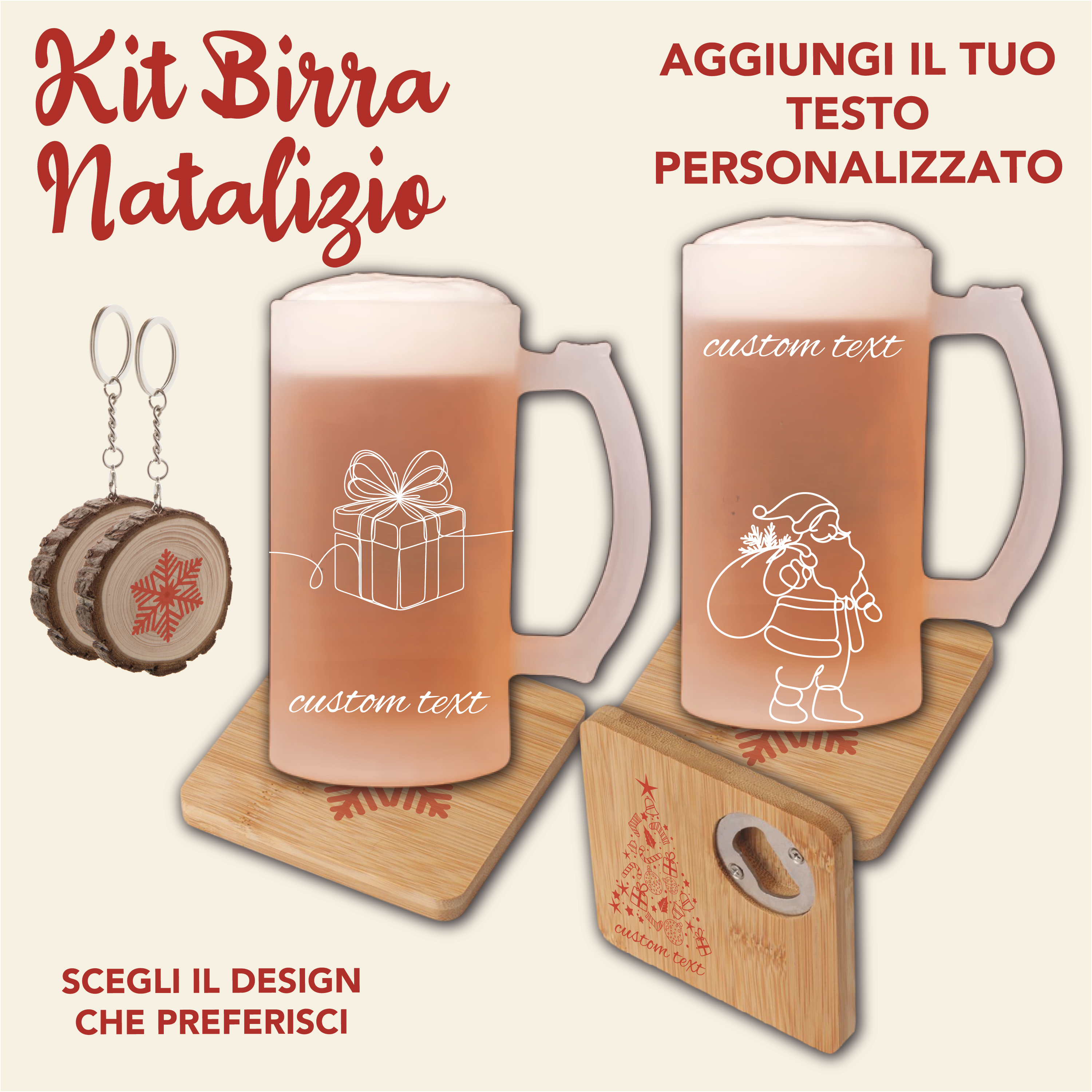 Kit Natalizio Birra: 2 Boccali +2 Sottobicchieri/ Apribottiglie 2 Portachiavi Personalizzati Con un Nome o una Breve Frase