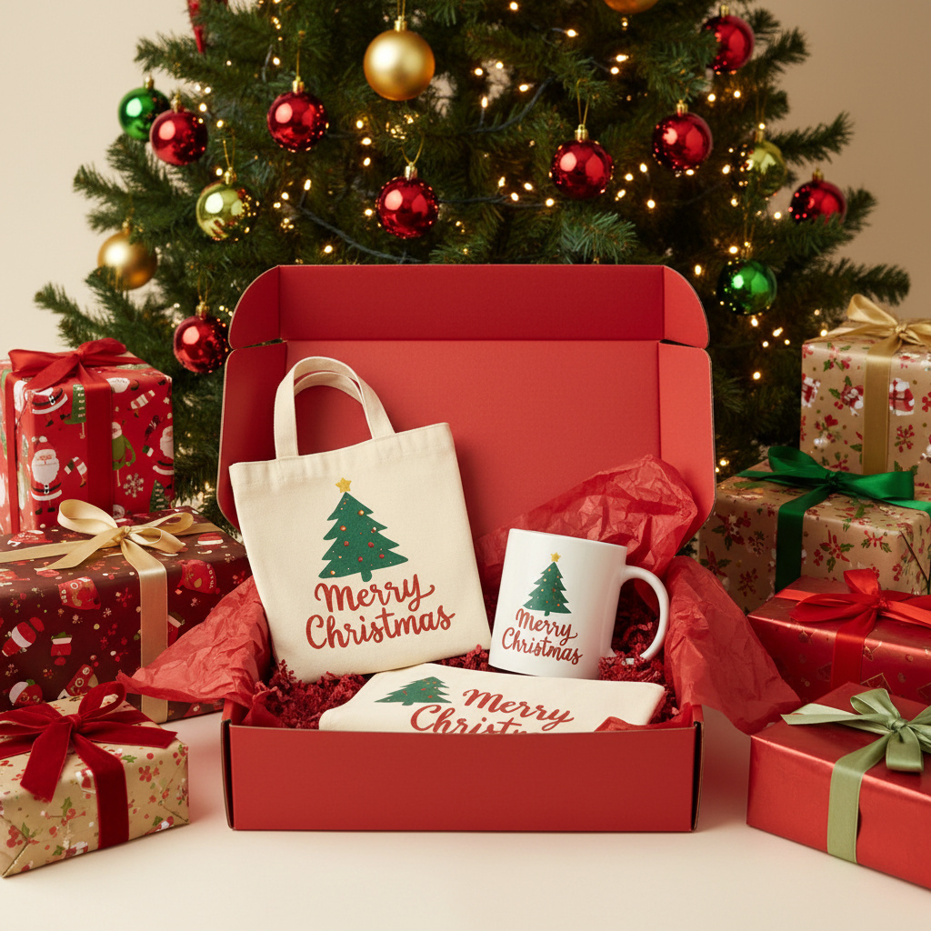 Rendi unico il tuo regalo di Natale con questo kit esclusivo composto da tre articoli coordinati: shopper in cotone naturale, tazza in ceramica e grembiule da cucina 100% cotone bianco.