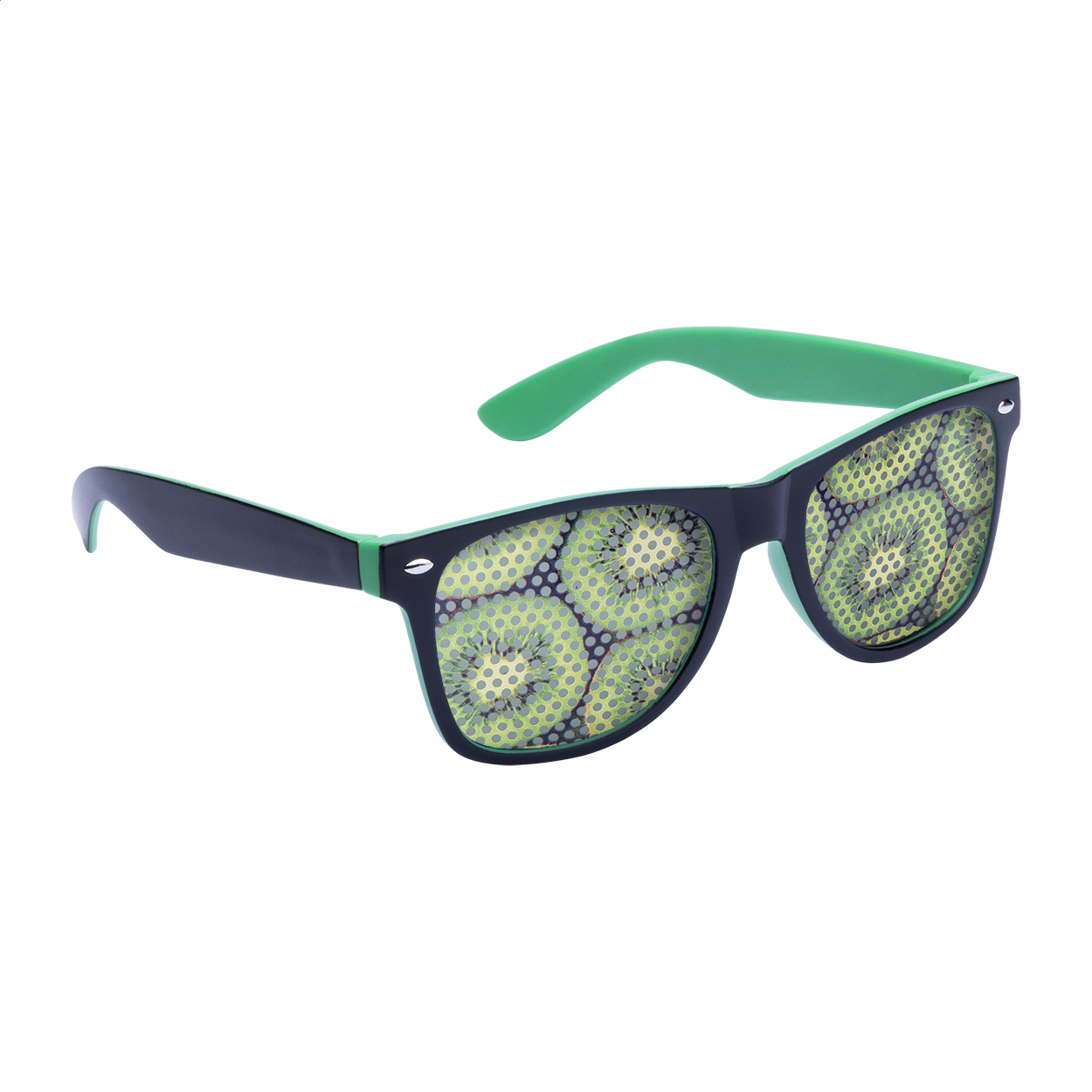Occhiali da sole in plastica con montatura bicolore, lenti specchiate e protezione UV 400.