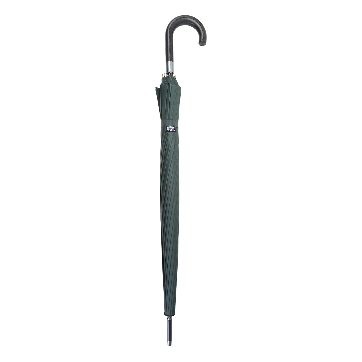 Ombrello automaticoin pongee 190T antivento di grandi dimensioni con 16 pannelli, manico in pelle PU, struttura in metallo, stecche in fibra di vetro, etichetta RPET e custodia.Prodotto a marchio André Philippe.