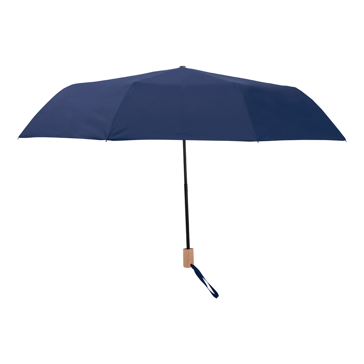 Ombrello pieghevole manuale, antivento ad 8 pannelli con fodera coordinata, struttura in metallo, stecche in fibra di vetro e manico in legno. Materiale: pongee 190T RPET ed etichetta RPET.