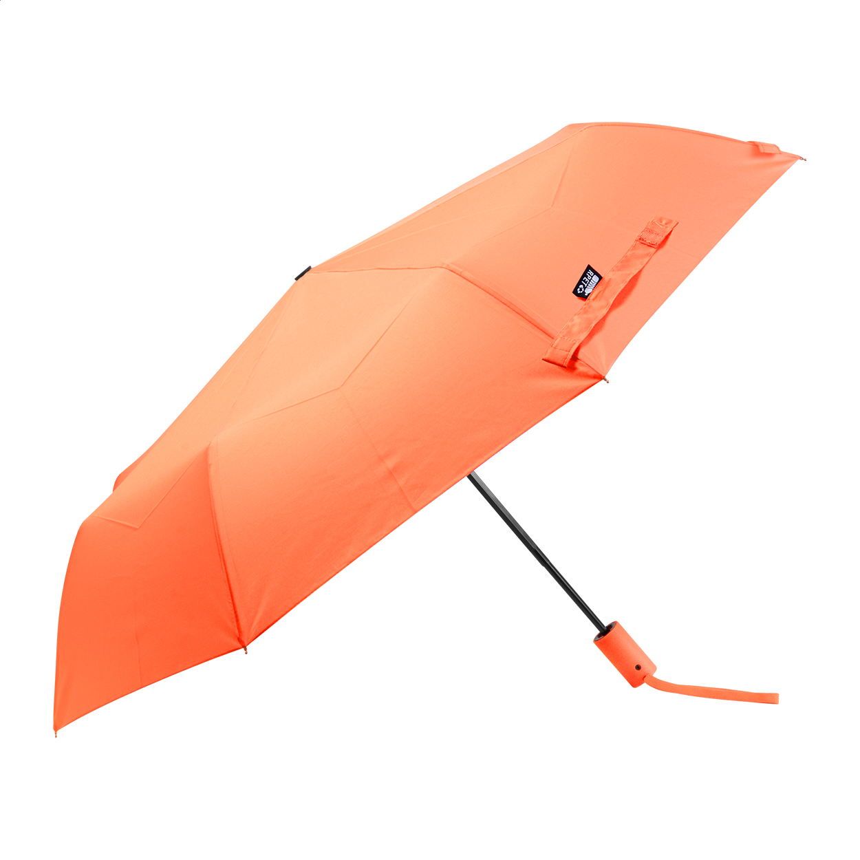Ombrello pieghevole completamente automatico (apertura/chiusura) in pongee RPET 190T, antivento, con 8 pannelli e astuccio in colore coordinato. Struttura in metallo, stecche in fibra di vetro, manico gommato ed etichetta RPET.