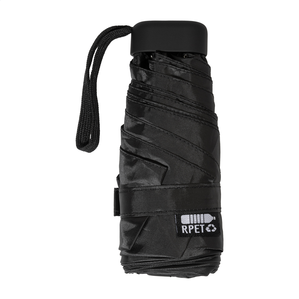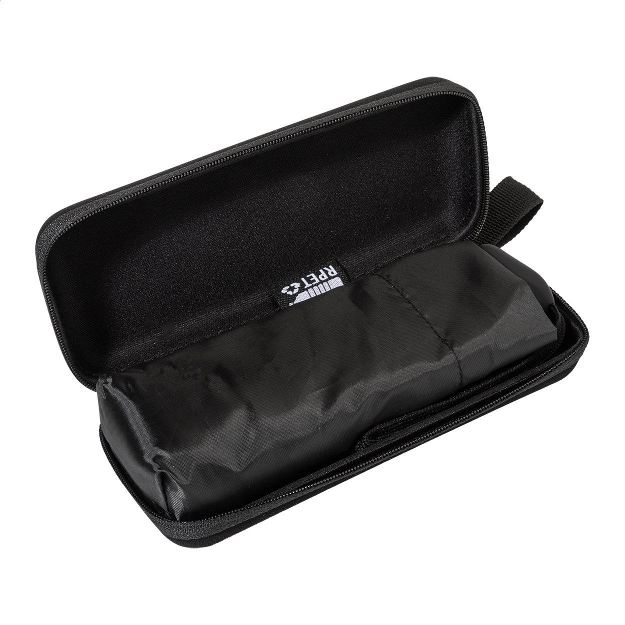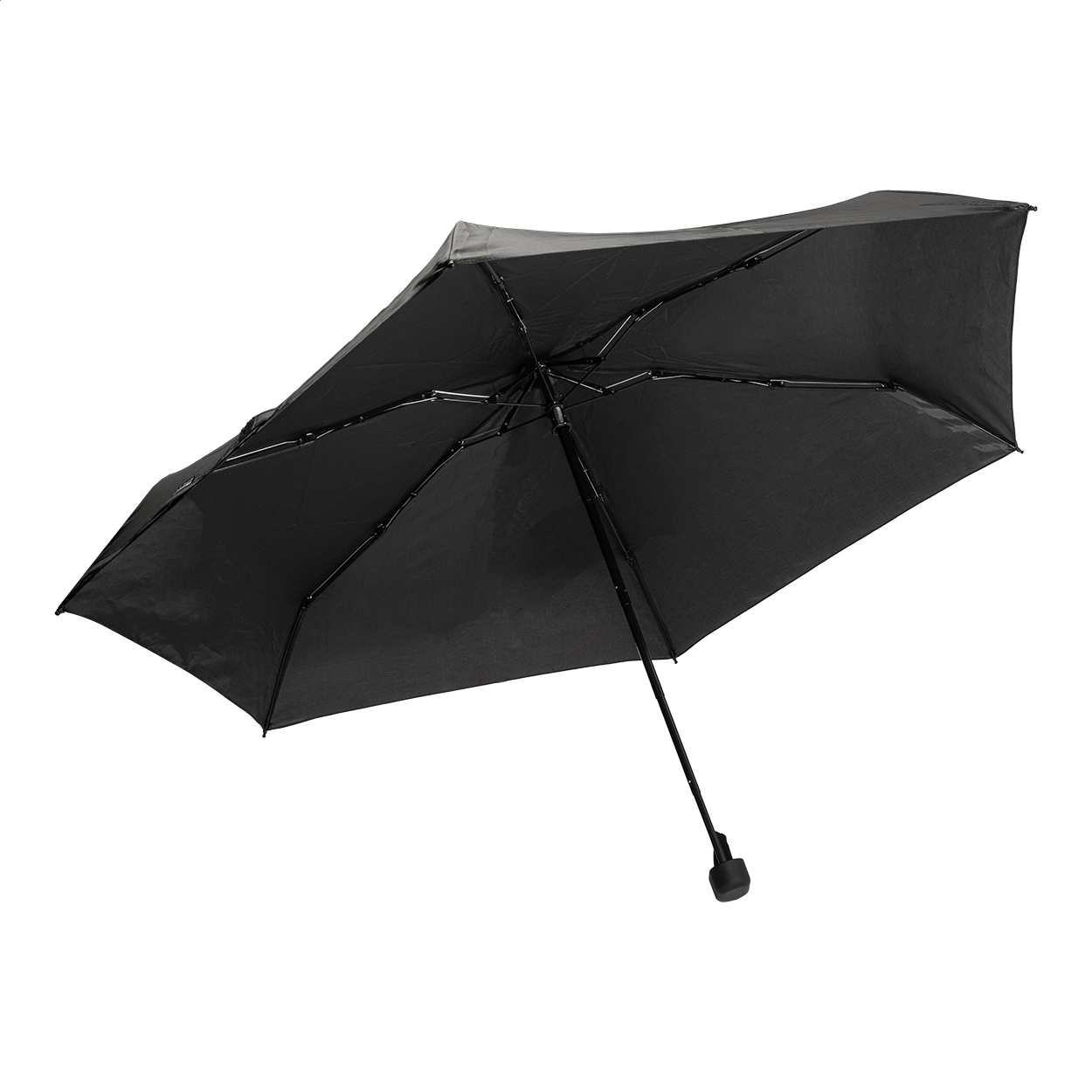 Mini ombrello antivento manuale e pieghevole in 3 parti con 6 pannelli in pongee 190T RPET, telaio in metallo, stecche in fibra di vetro, manico compatto con cinturino, sacchetto coordinato, custodia rigida in EVA con cerniera ed etichetta RPET.