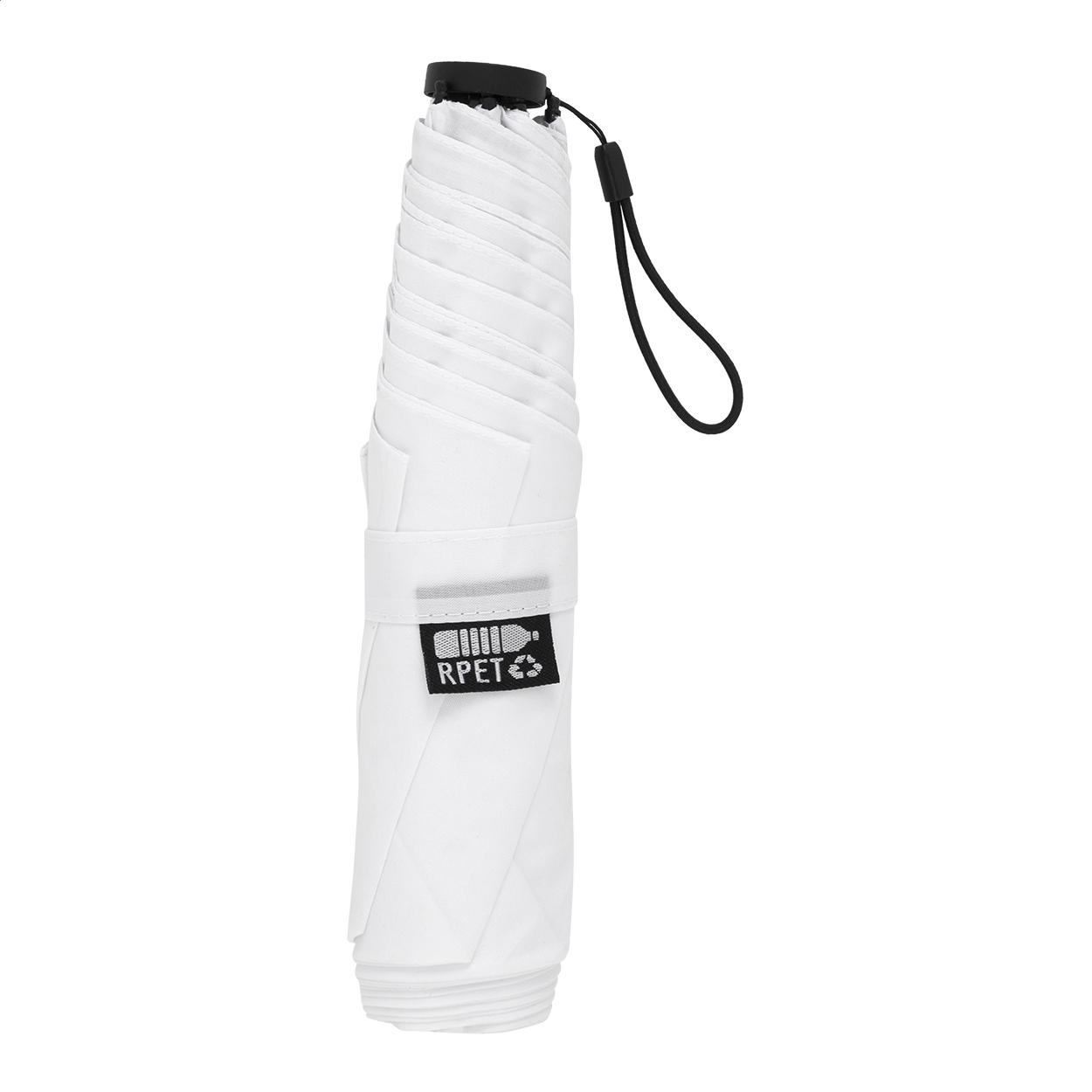 Mini-ombrello manuale in pongee RPET 190T, antivento a 3 elementi ultraleggero (130 g), con 6 pannelli, struttura in metallo, stecche in fibra di vetro, manico compatto con cinturino, custodia in colore coordinato ed etichetta RPET.