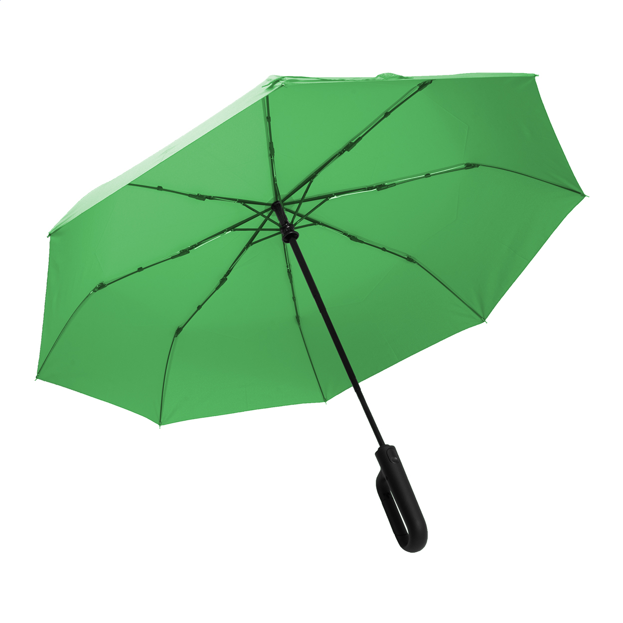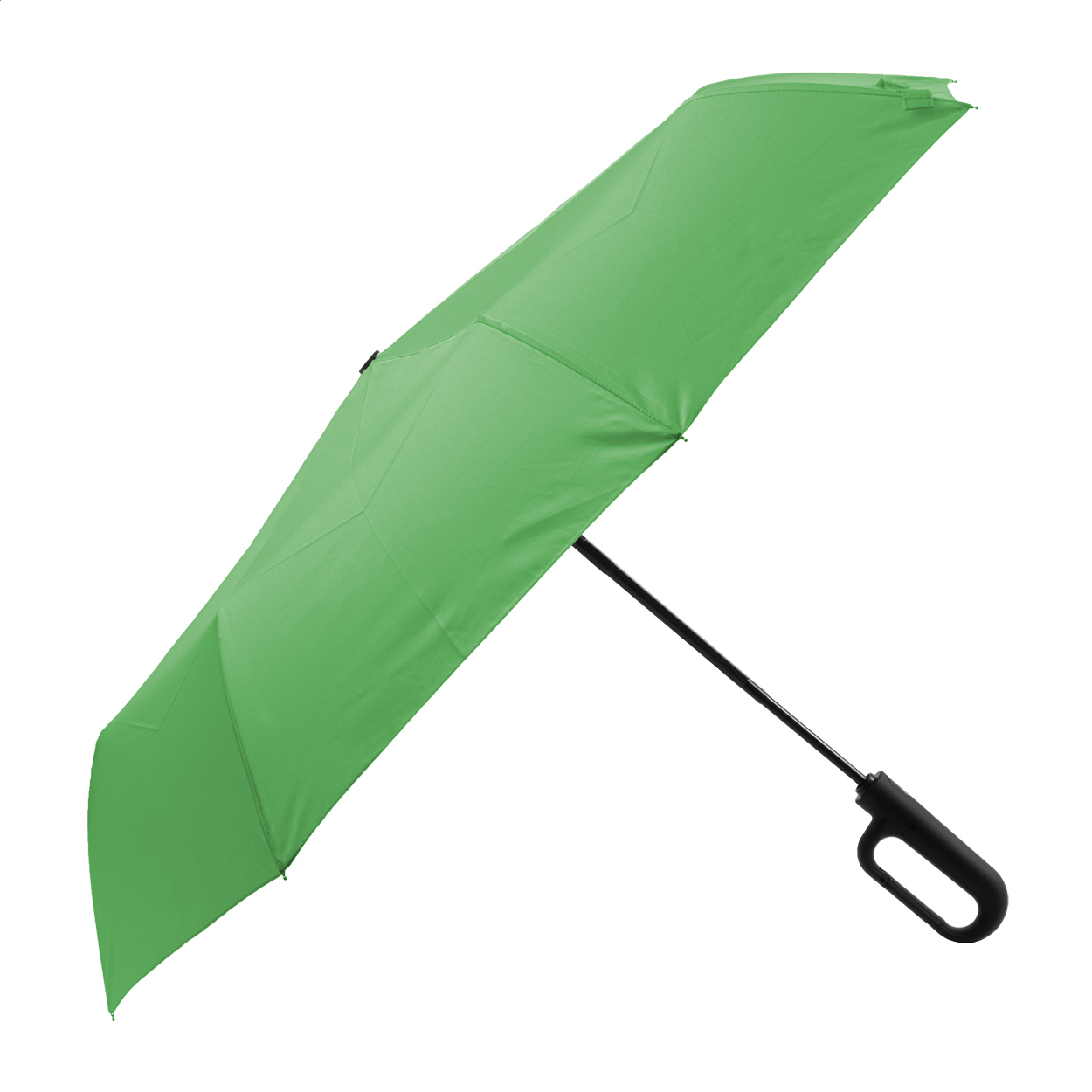Ombrello pieghevole completamente automatico (apertura/chiusura) in pongee RPET 190T, antivento, con 8 pannelli e astuccio in colore coordinato. Struttura in metallo, stecche in fibra di vetro, manico gommato ad anello con moschettone ed etichetta RPET.