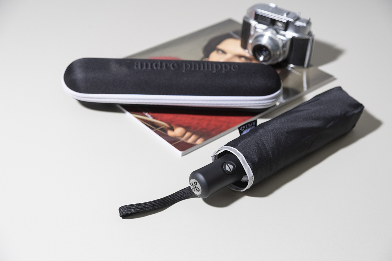 Ombrello pieghevole in pongee RPET 190T completamente automatico (apertura/chiusura), antivento, a 8 pannelli, con finiture argentate, struttura in metallo, stecche in fibra di vetro, manico gommato, custodia rigida ed etichetta RPET.Prodotto a marchio André Philippe.