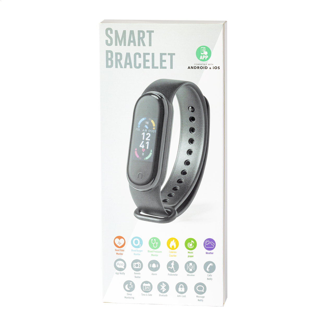 Smartwatch multilingue e wireless con schermo TFT da 0,96" e cinturino in TPU. Con funzioni di monitoraggio della frequenza cardiaca, della pressione sanguigna e dell'ossigeno nel sangue. Cavo di ricarica USB incluso.