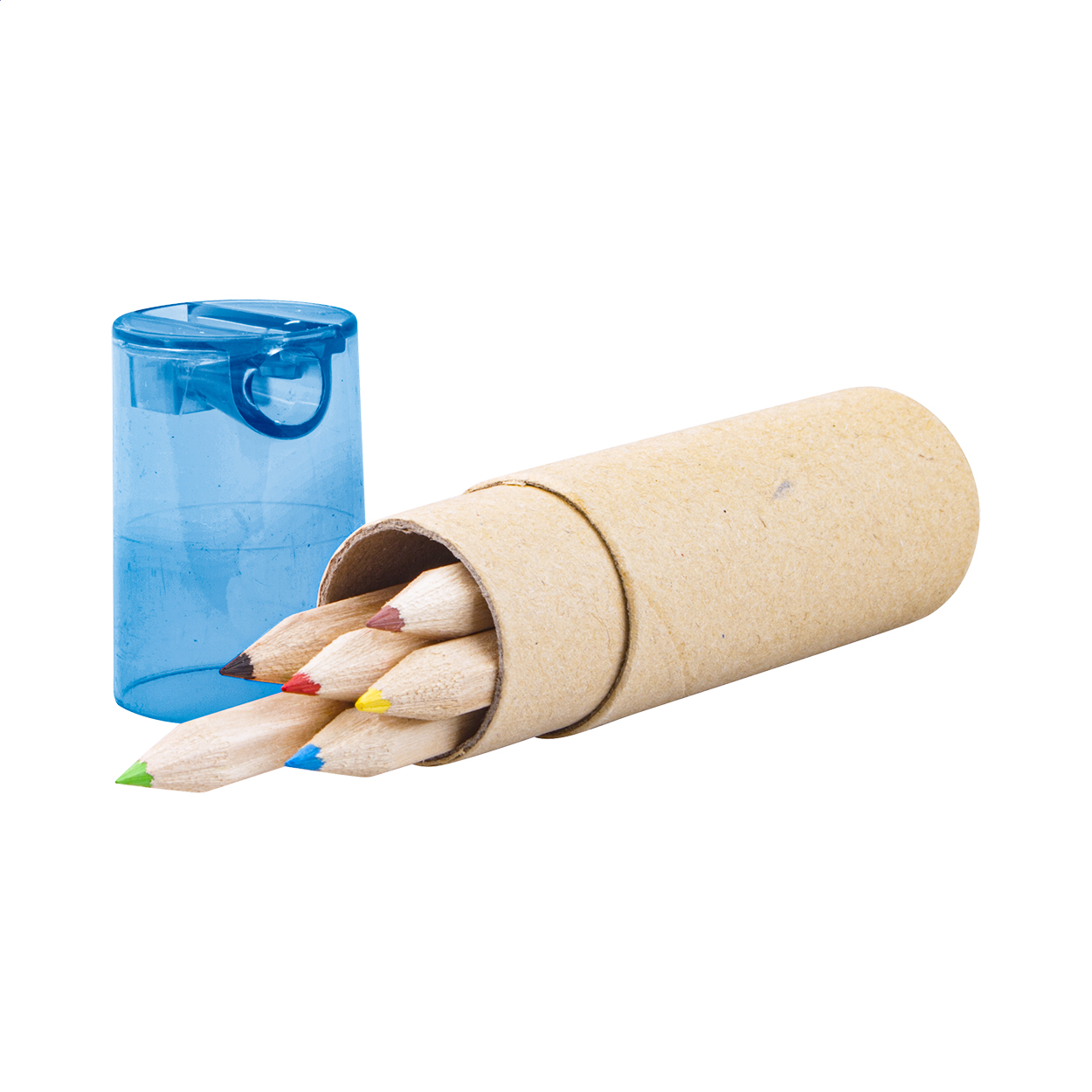 Set 6 matite colorate in confezione cilindrica di cartoncino con temperino in plastica.