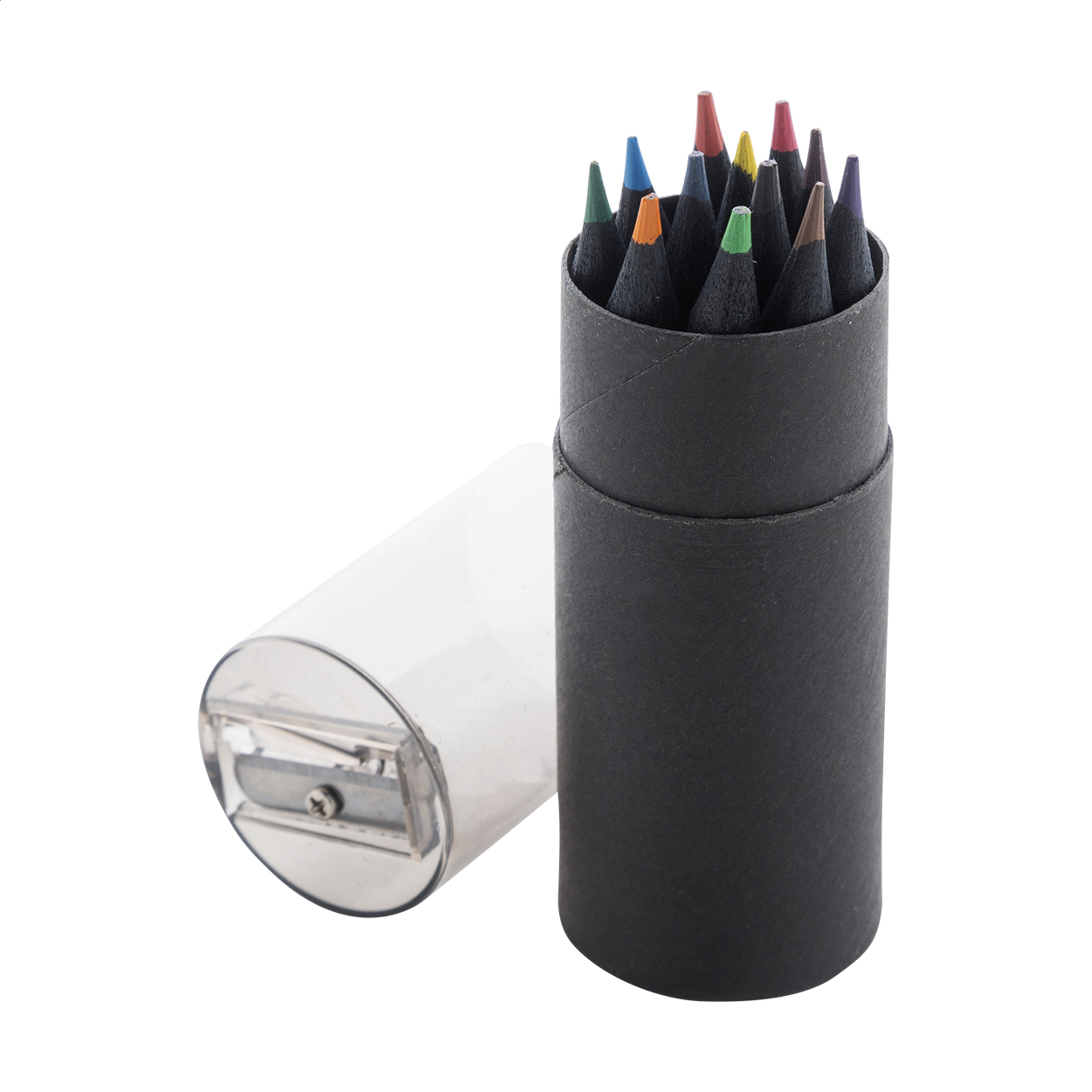 Set di 12 matite in legno nero contenute in un astuccio di cartoncino nero e temperamatite in plastica.