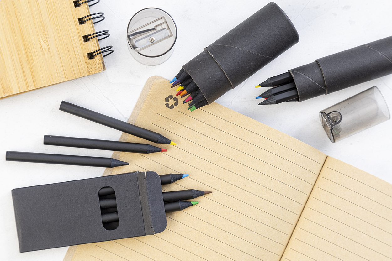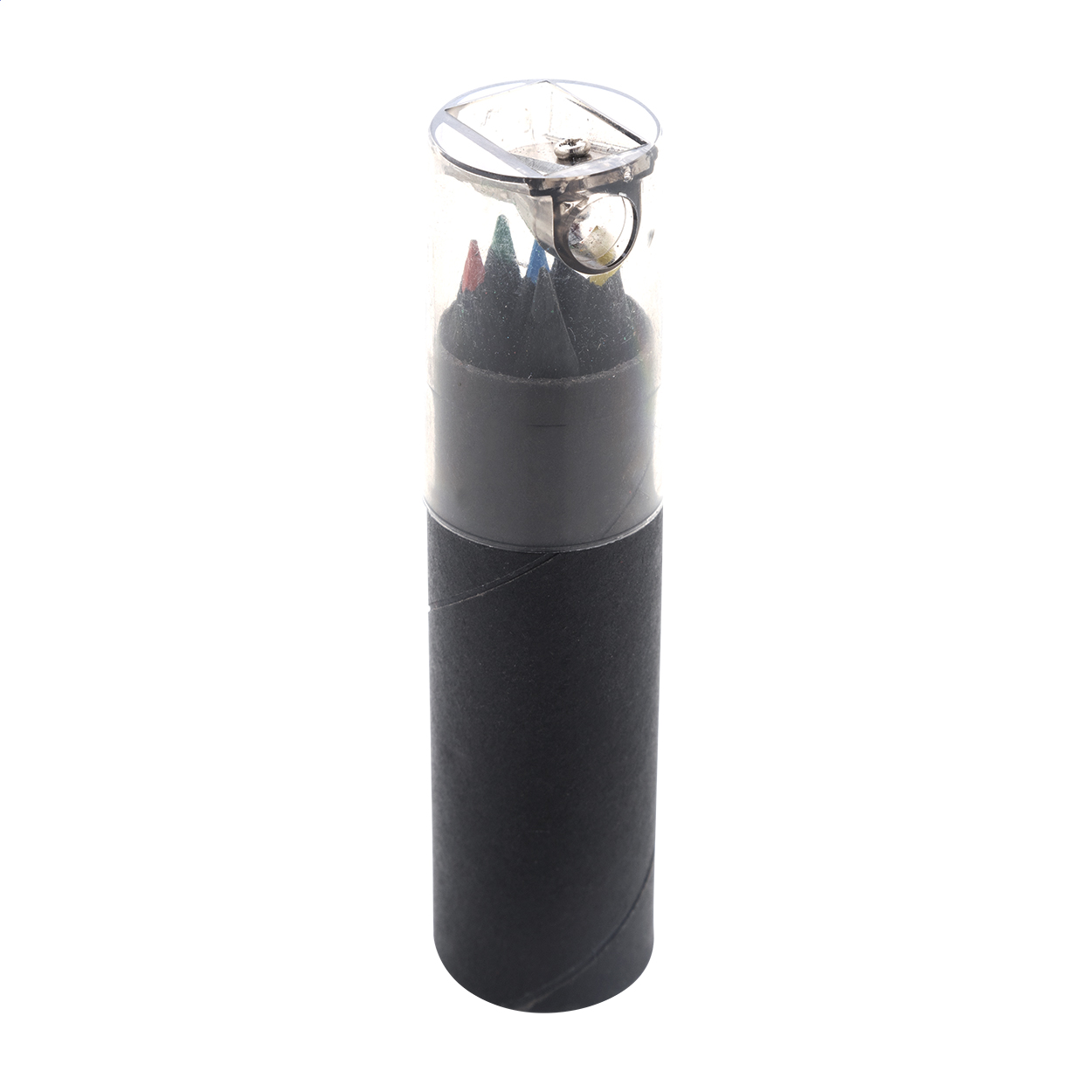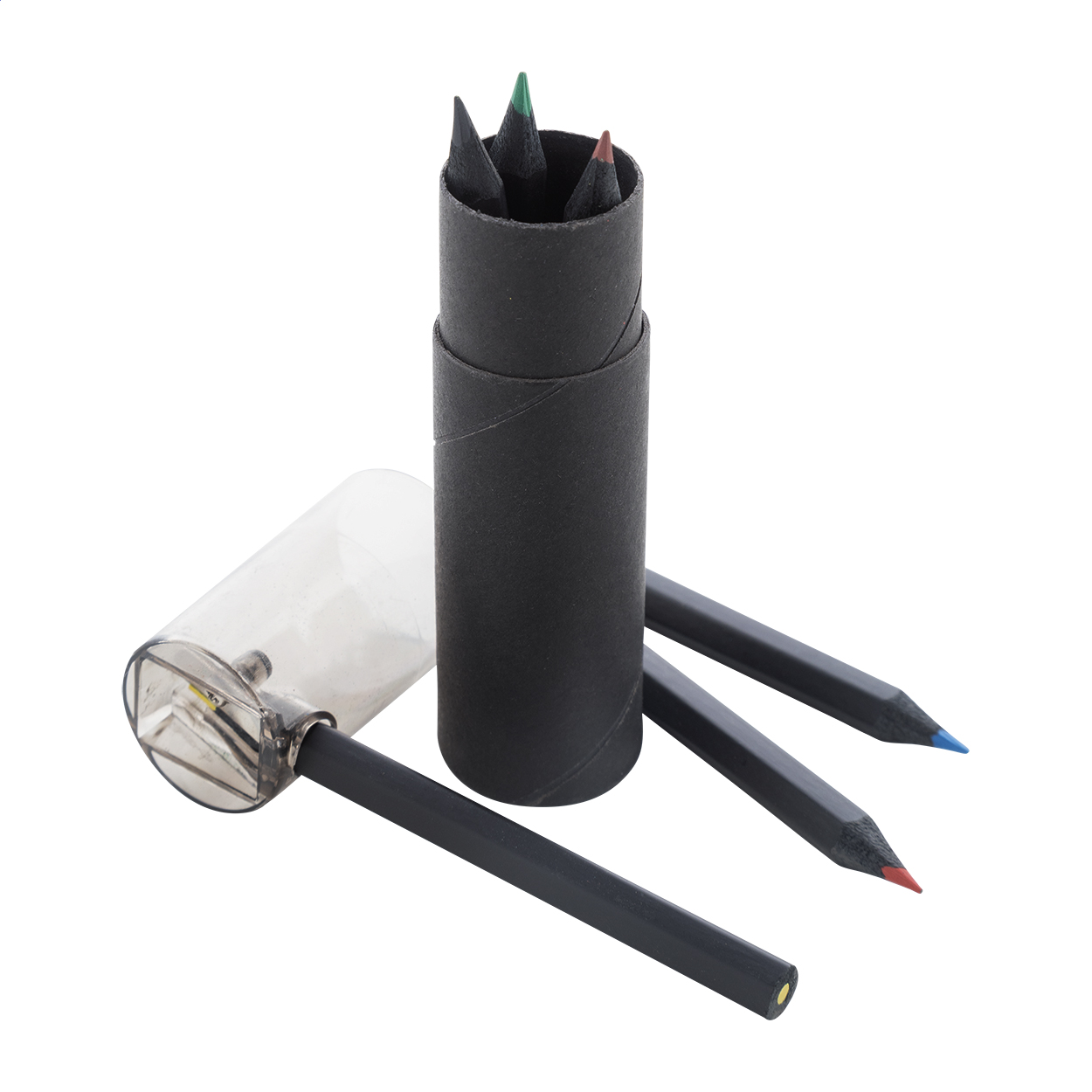 Set di 6 matite in legno nero contenute in un astuccio di cartoncino nero e temperamatite in plastica.