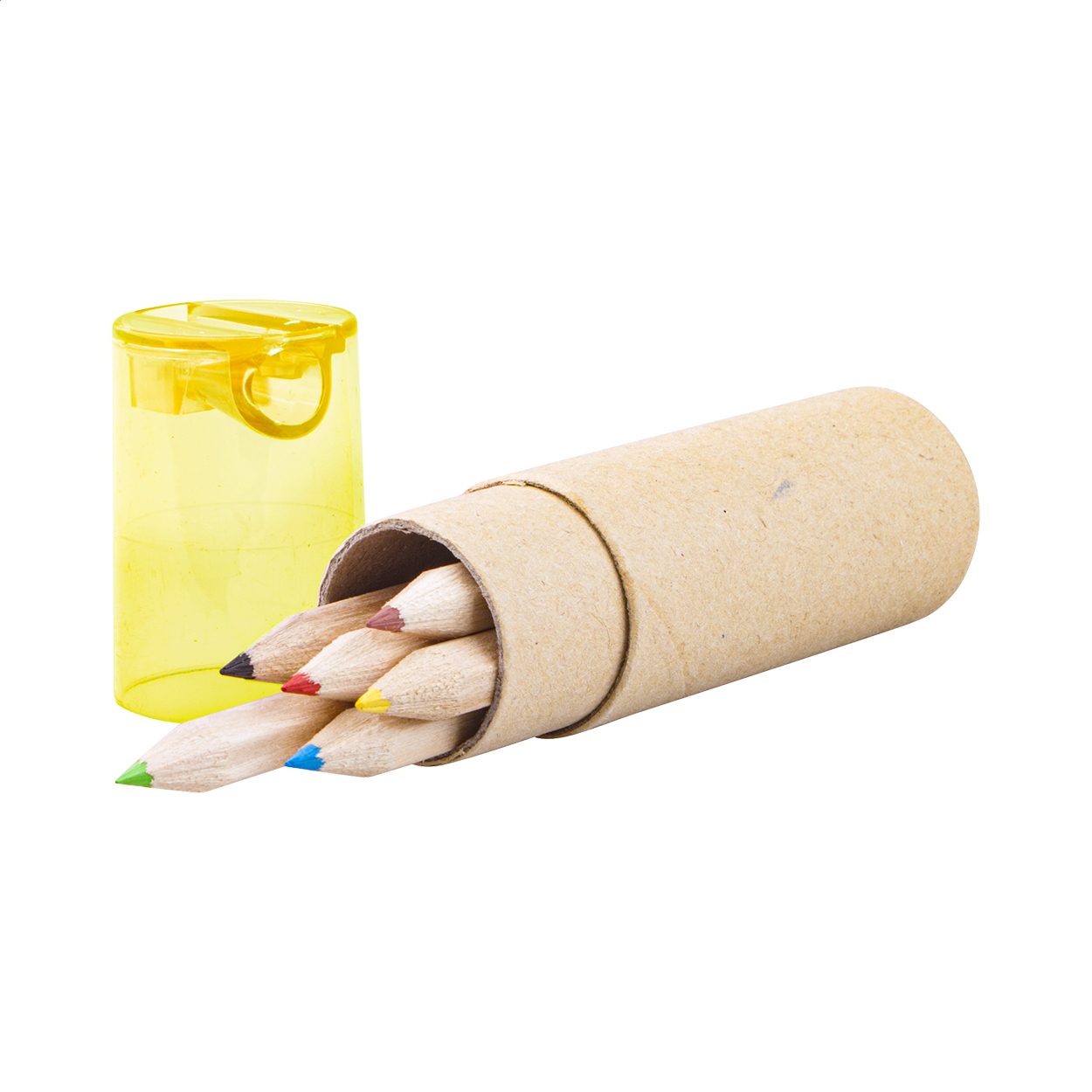 Set 6 matite colorate in confezione cilindrica di cartoncino con temperino in plastica.