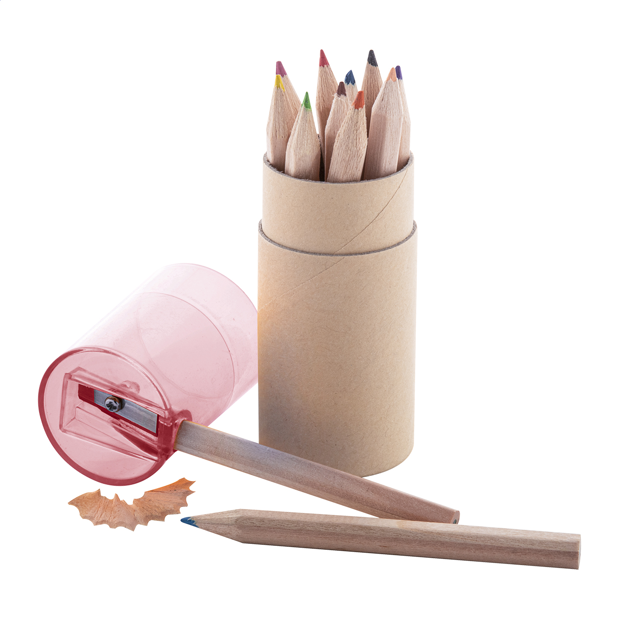 Set 12 matite colorate in confezione cilindrica in cartoncino con temperino in plastica.