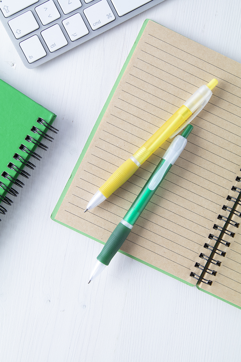 Penna a sfera in plastica con impugnatura gommata. Fornita con refill blu.