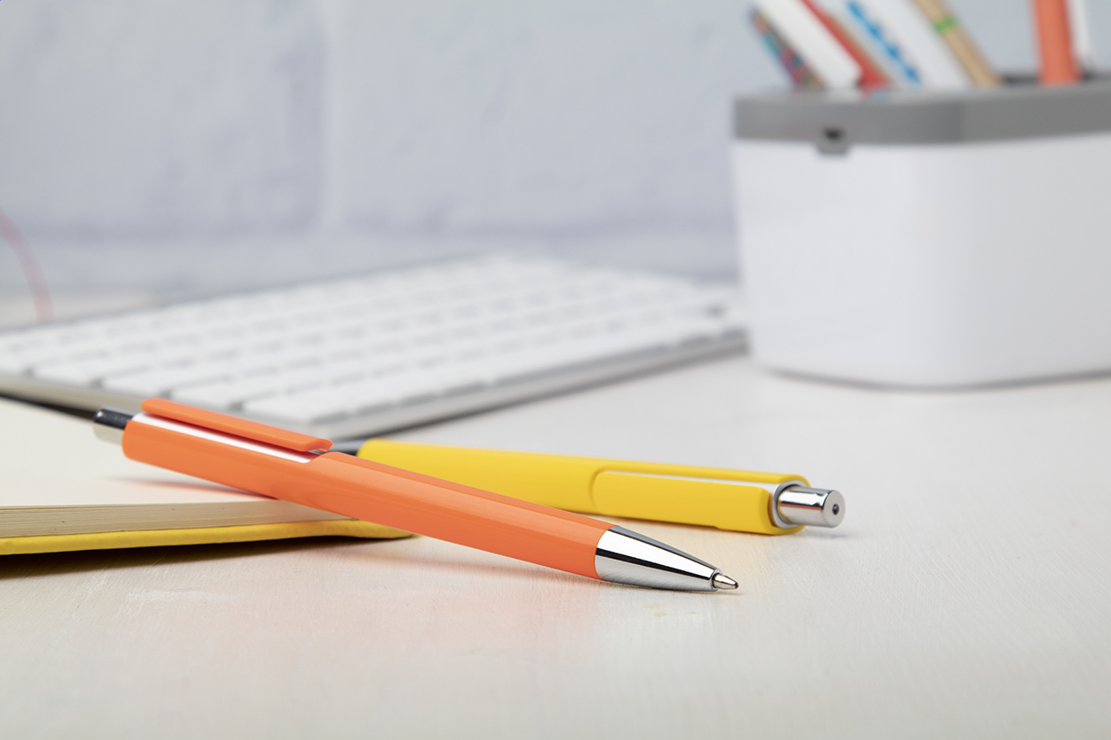 Penna a sfera in plastica con corpo colorato e parti cromate. Fornita con refill blu.