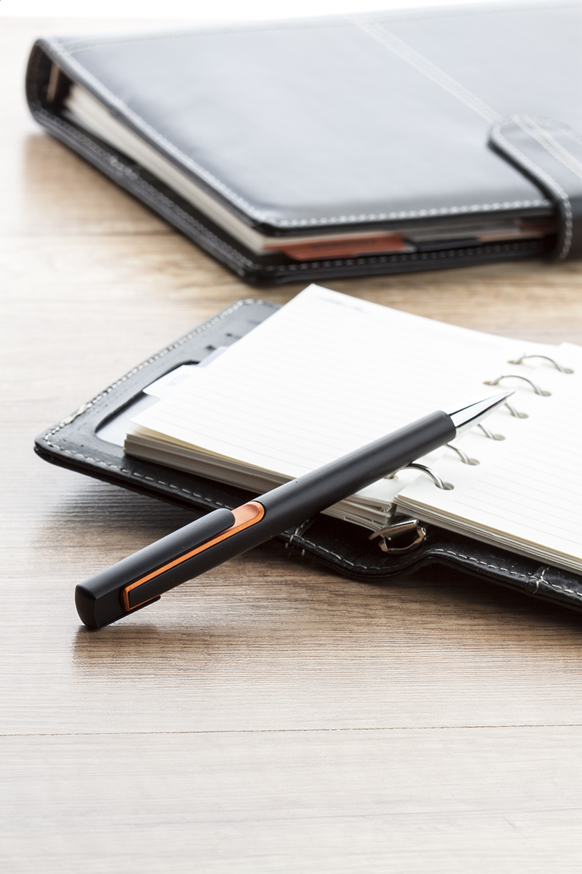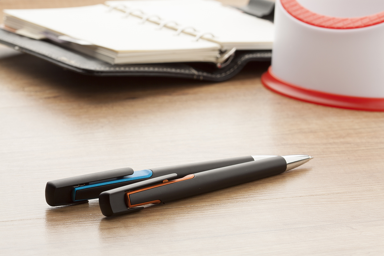 Penna a sfera in plastica nera con particolari colorati e puntale in cromato. Fornita con refill blu.