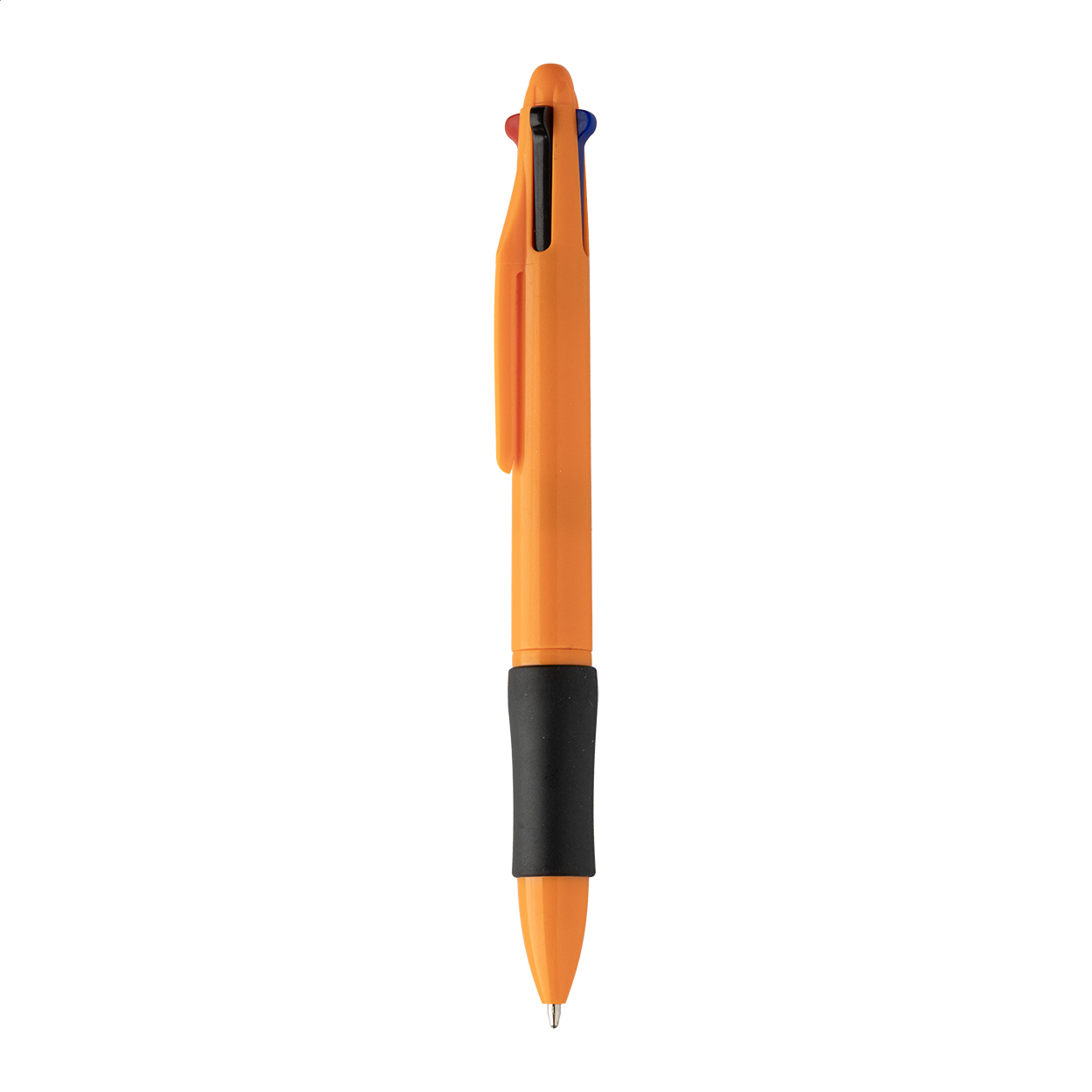 Penna a sfera multicolore in ABS riciclato con impugnatura in gomma. Refill nei colori nero, blu, rosso e verde.