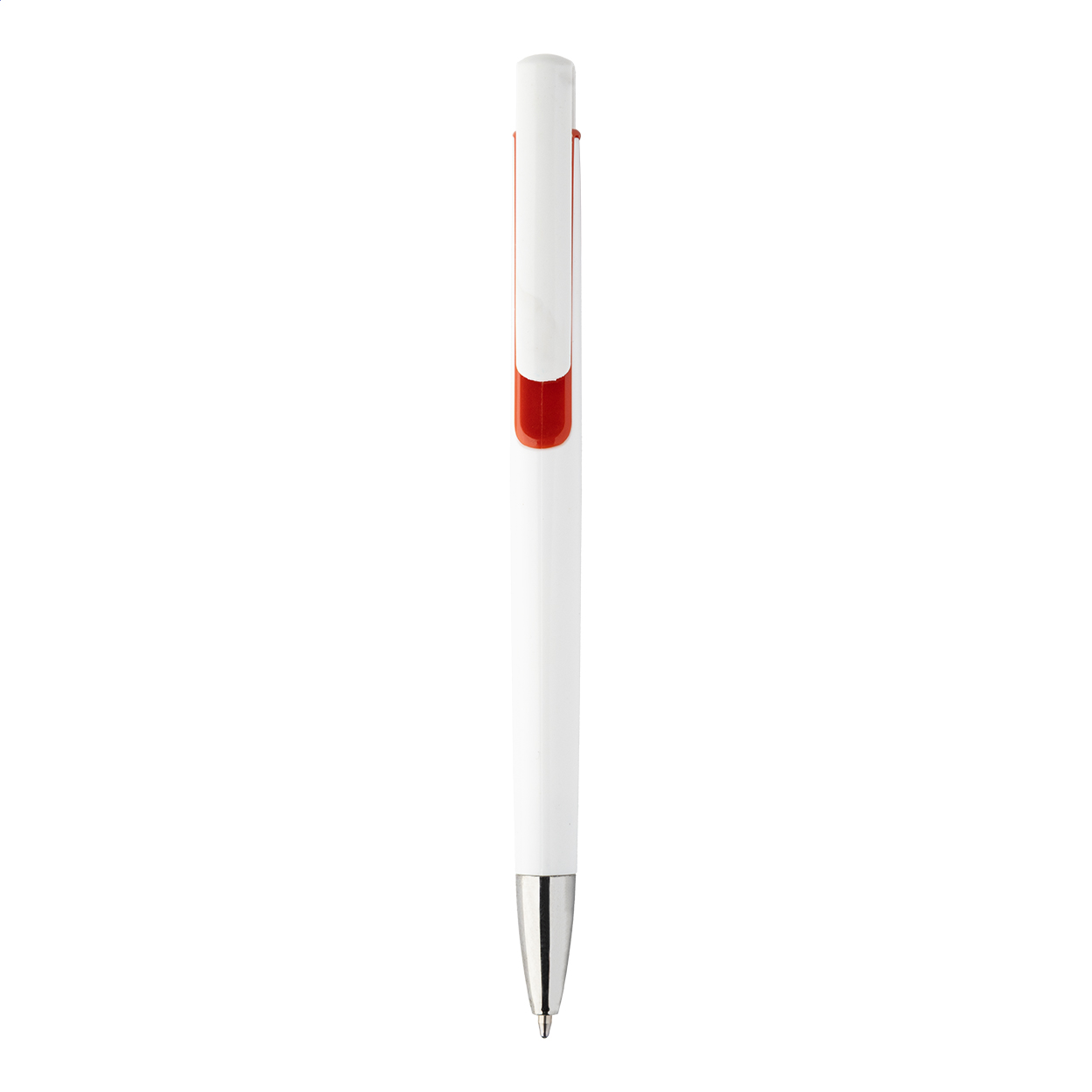 Penna a sfera in plastica bianca con particolari colorati e puntale cromato. Fornita con refill blu.
