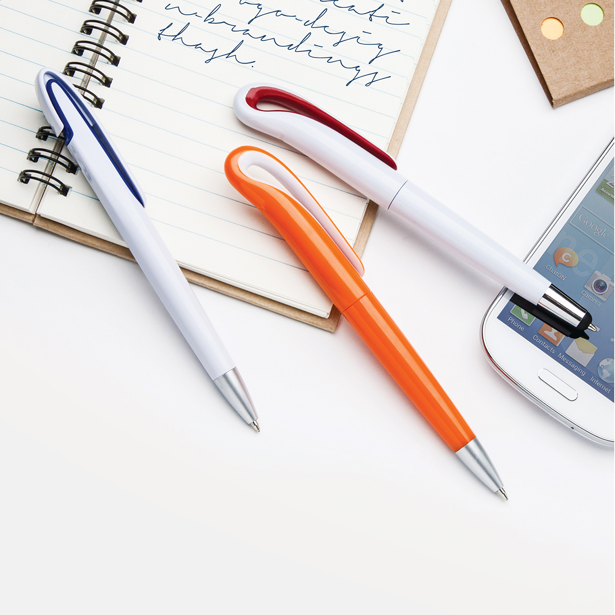 Penna a sfera in plastica bianca particolari colorati e puntale cromato. Fornita con refill blu.