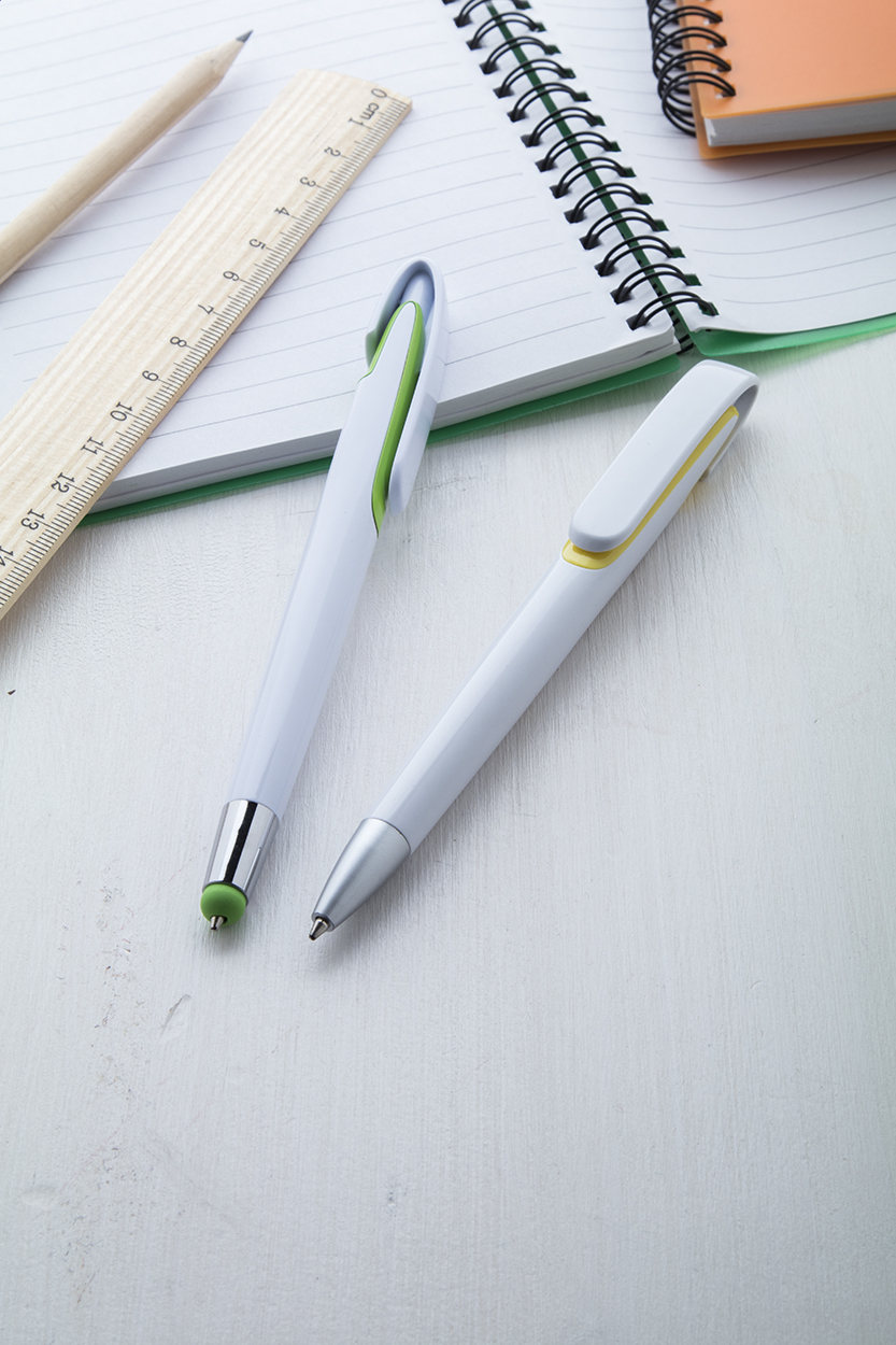 Penna a sfera in plastica bianca particolari colorati e puntale cromato. Fornita con refill blu.