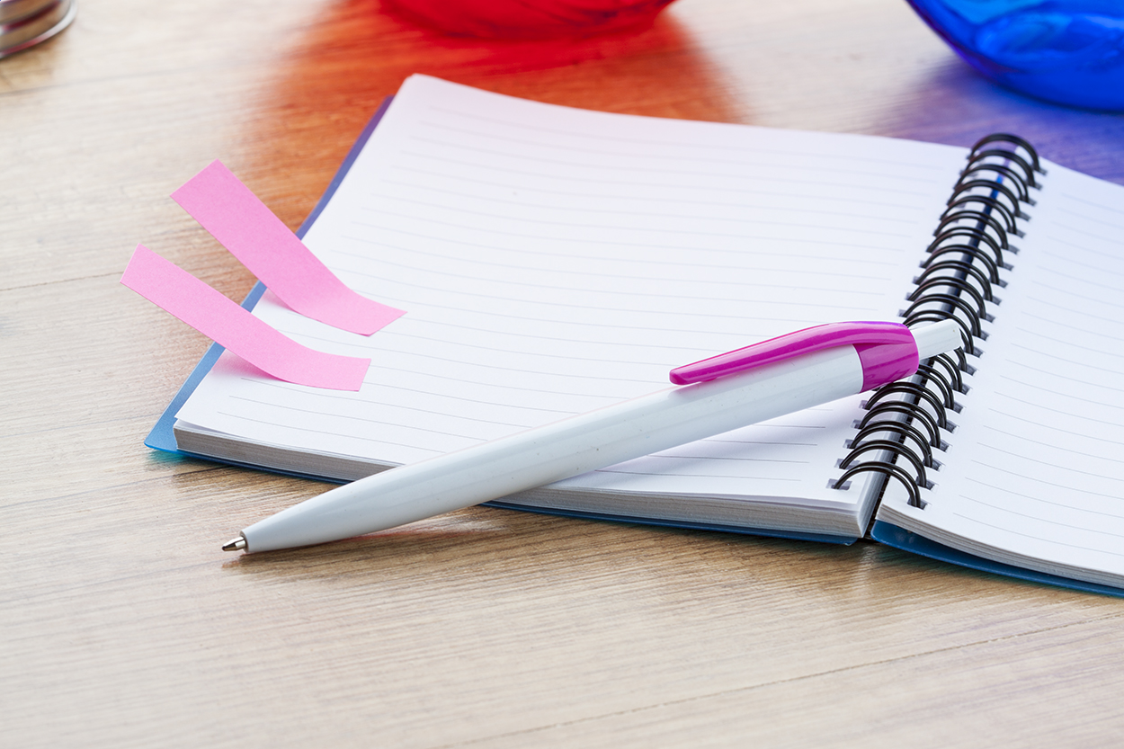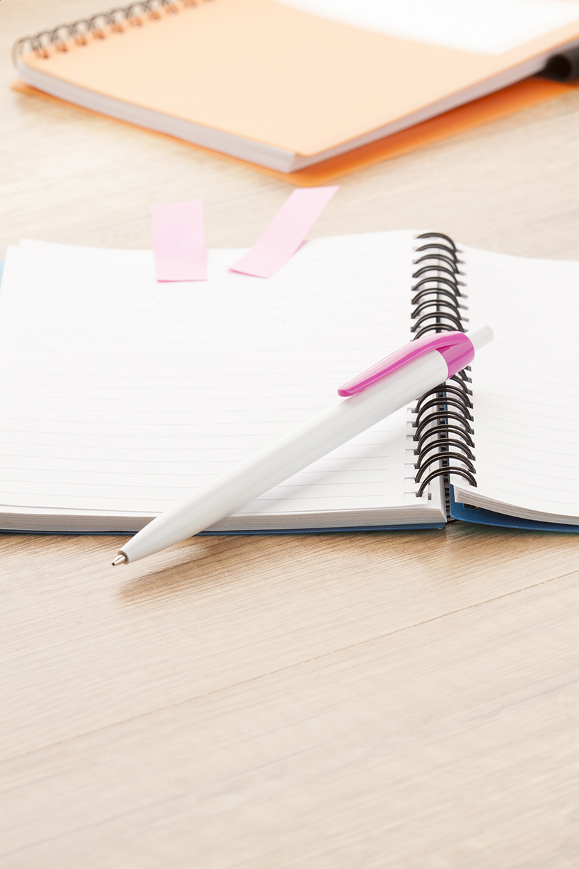 Penna a sfera in plastica con fusto bianco e clip colorata. Fornita con refill blu.