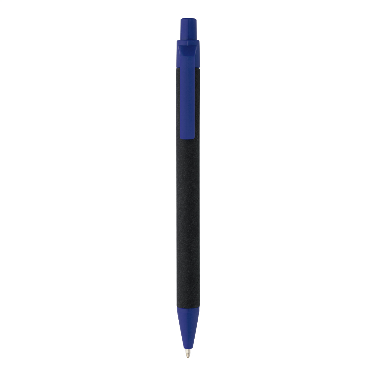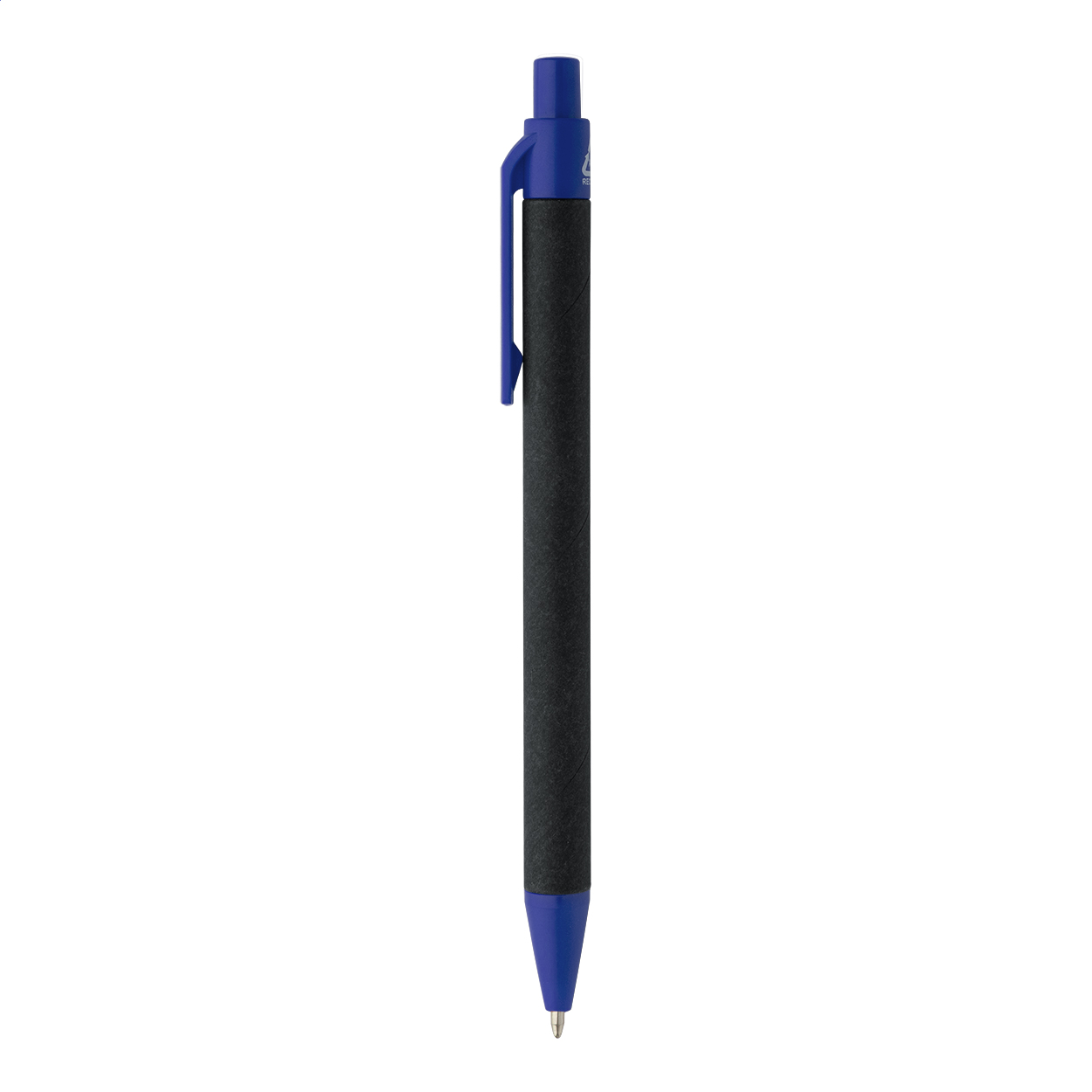 Penna a sfera in carta riciclata con corpo nero, elementi in ABS riciclato e refill blu.