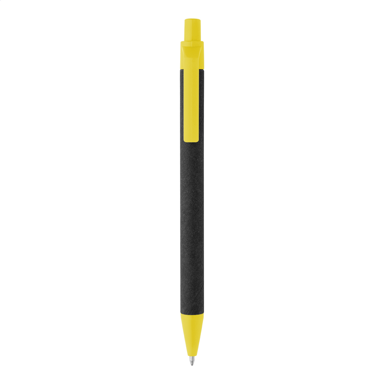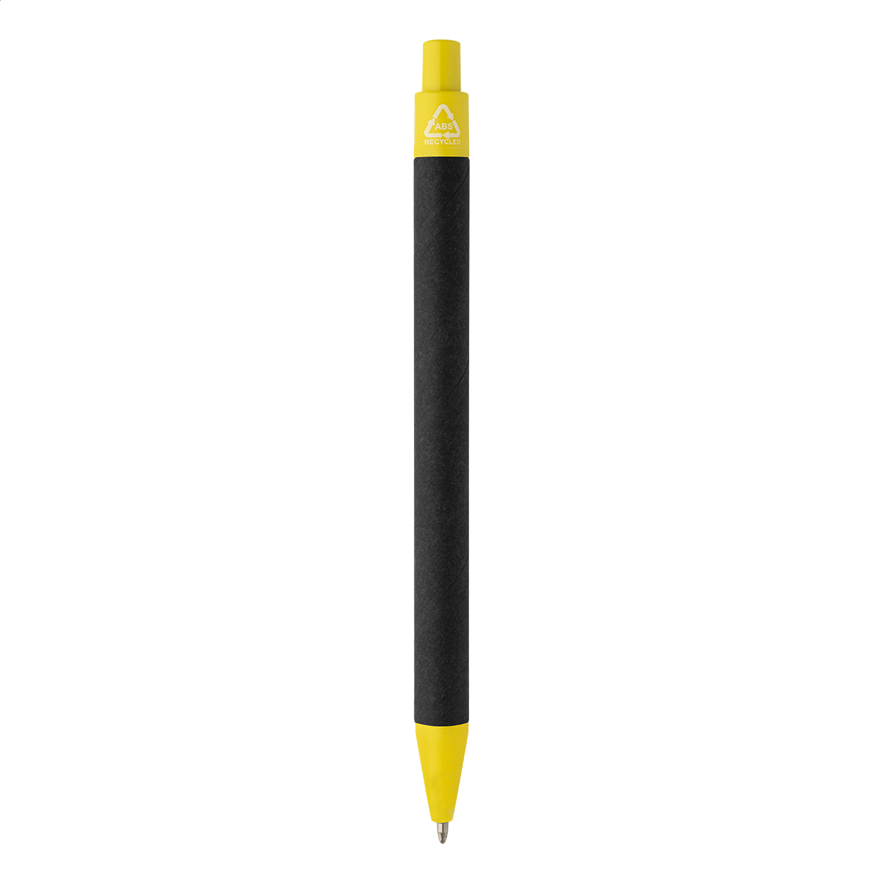 Penna a sfera in carta riciclata con corpo nero, elementi in ABS riciclato e refill blu.