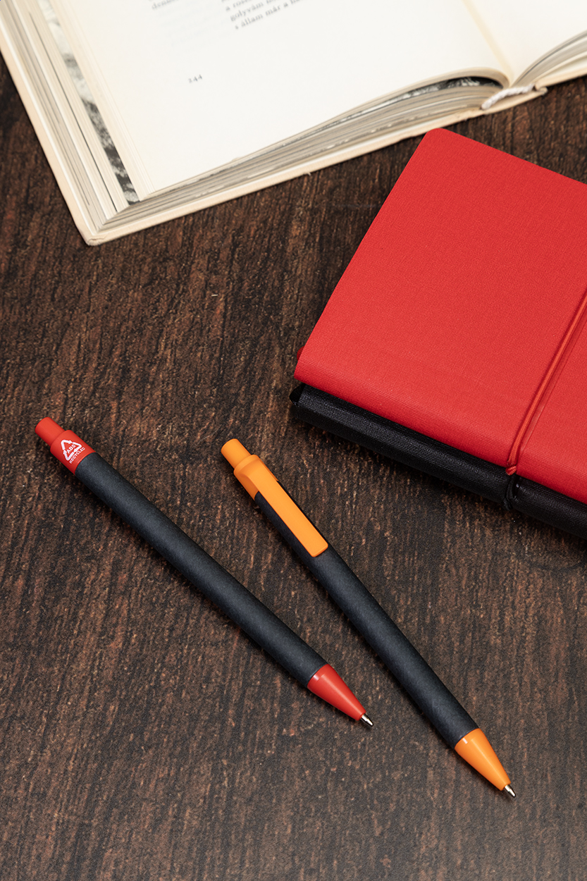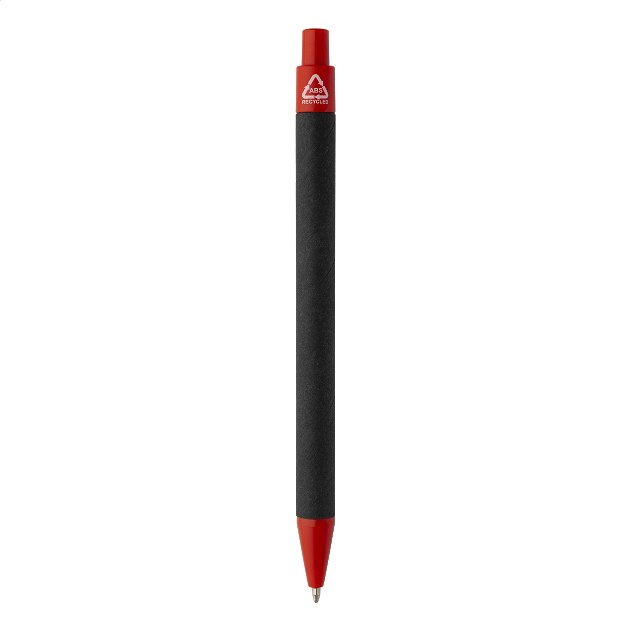Penna a sfera in carta riciclata con corpo nero, elementi in ABS riciclato e refill blu.