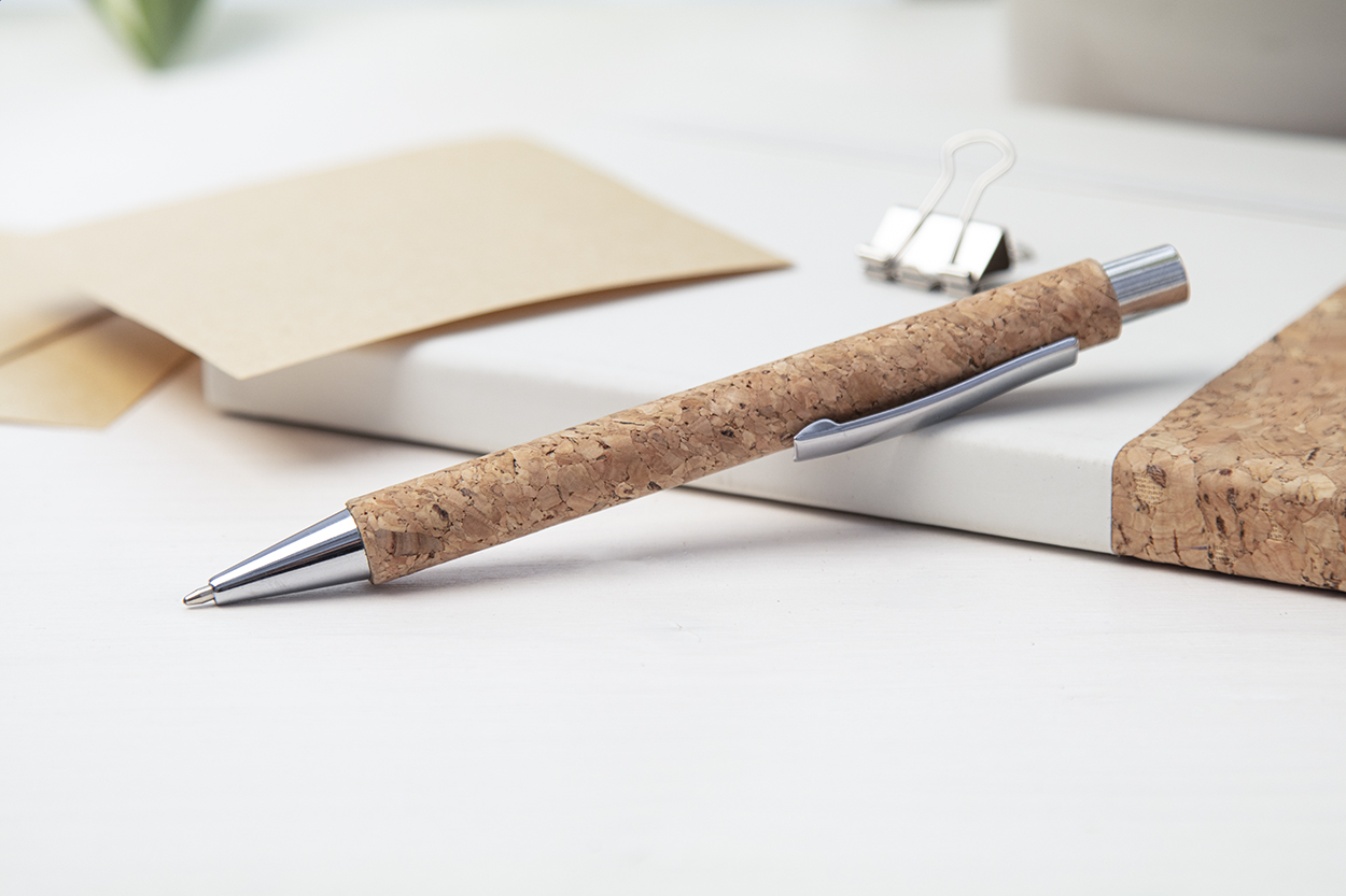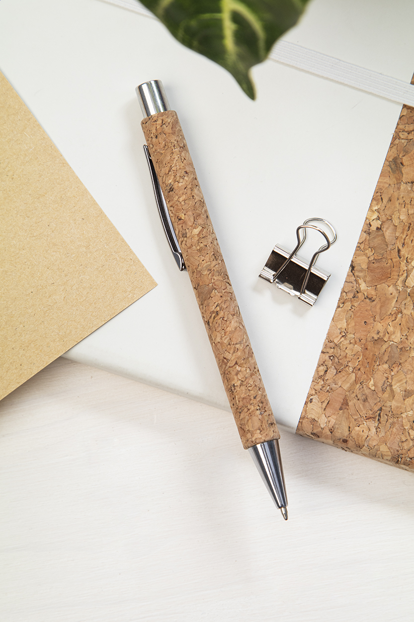 Penna a sfera in carta riciclata ricoperta di sughero naturale con parti in metallo e refill blu.