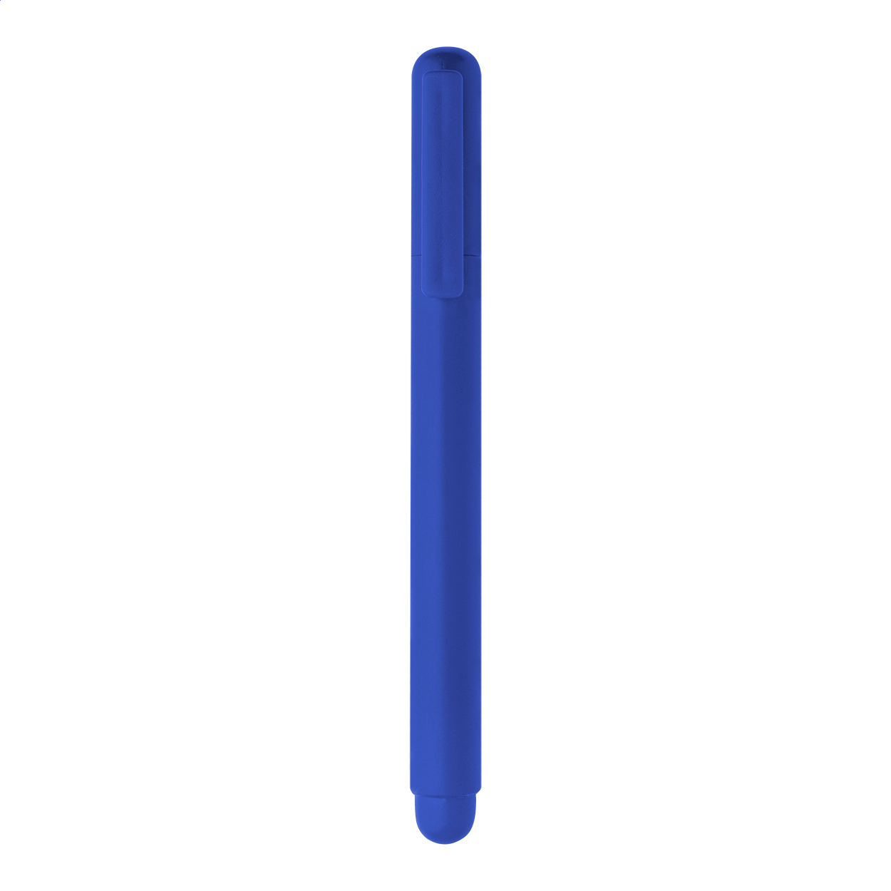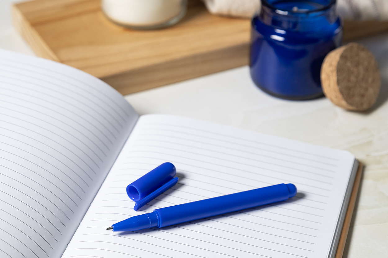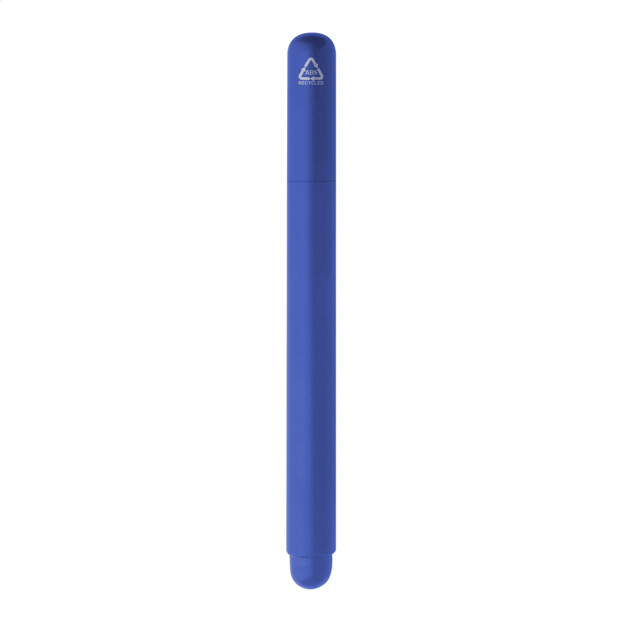 Penna in ABS riciclato con cappuccio e refill in gel blu.