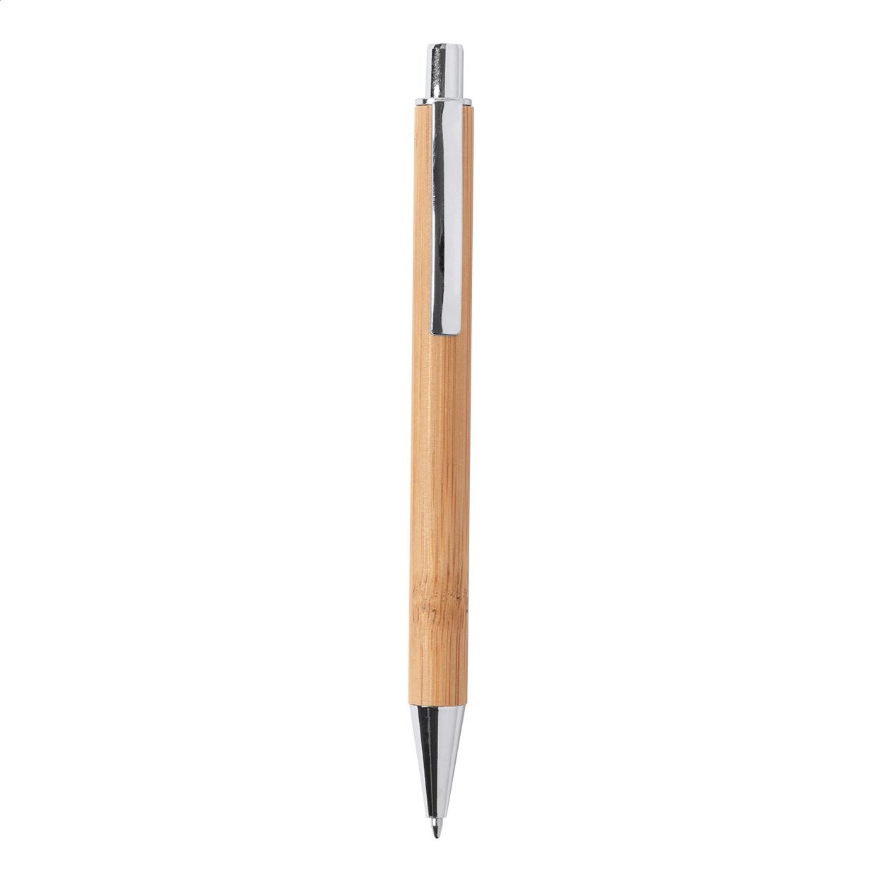 Penna a sfera in bambù con clip in plastica e refill blu.