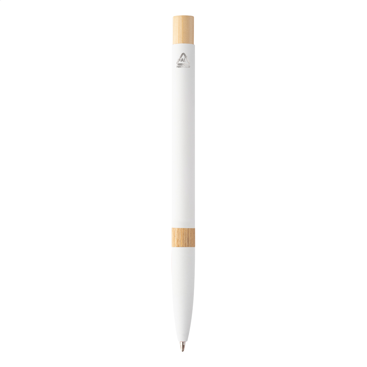 Penna a sfera in alluminio riciclato con parti in bambù, clip cromata, refill blu e rivestimento gommato speciale per incisione laser a specchio.