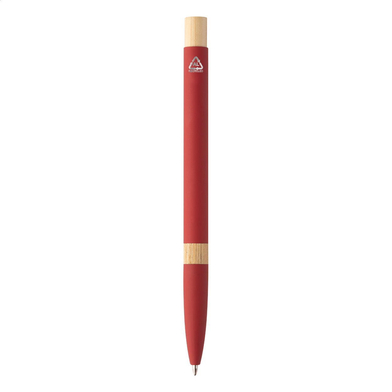 Penna a sfera in alluminio riciclato con parti in bambù, clip cromata, refill blu e rivestimento gommato speciale per incisione laser a specchio.